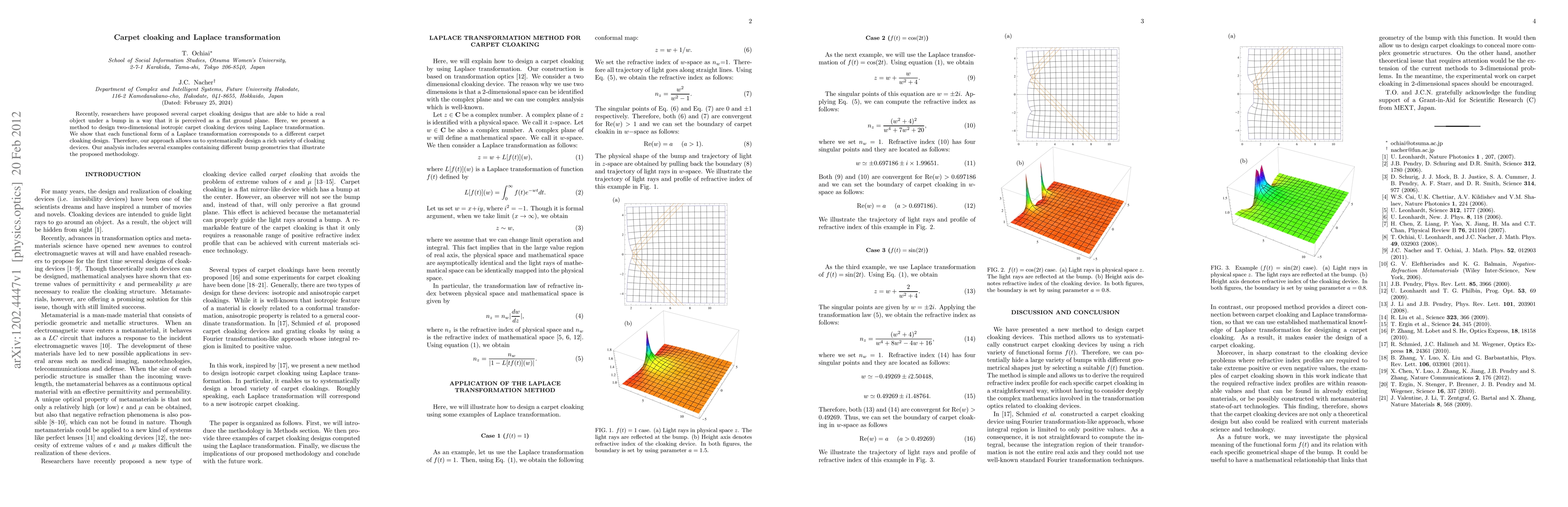 This paper introduces a method for designing two-dimensional isotropic carpet cloaking devices using Laplace transformation, demonstrating that different functional forms of the transformation correspond to various cloaking designs, thereby enabling systematic creation of diverse cloaking solutions. Examples with varied bump geometries are provided to illustrate the proposed methodology.