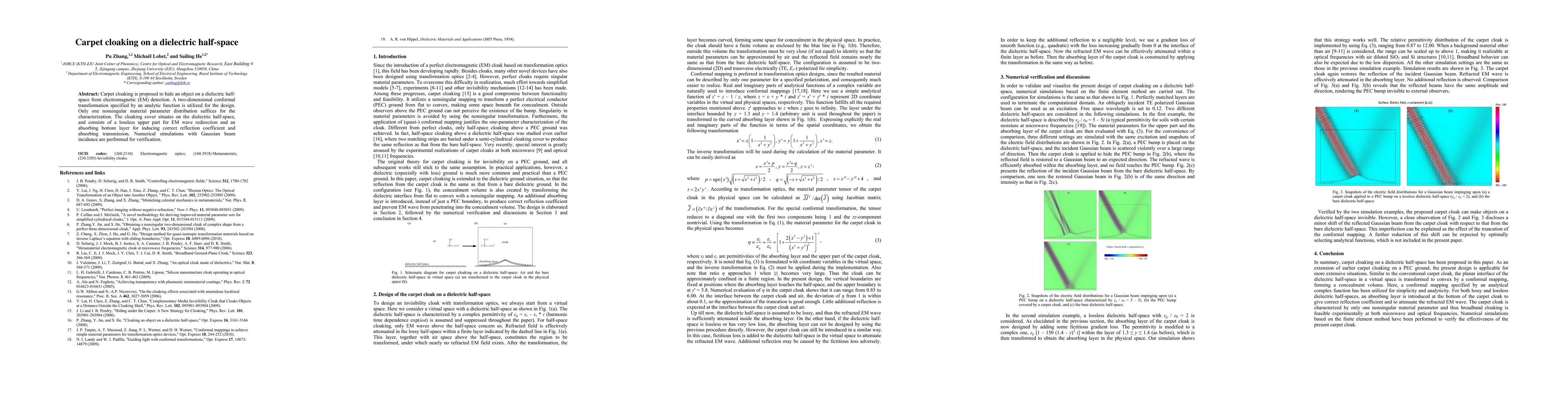 This paper proposes a method for carpet cloaking on a dielectric half-space using a two-dimensional conformal transformation. The cloak employs a single nonsingular material parameter distribution and consists of a lossless upper part and an absorbing bottom layer to redirect and absorb electromagnetic waves, verified through numerical simulations.