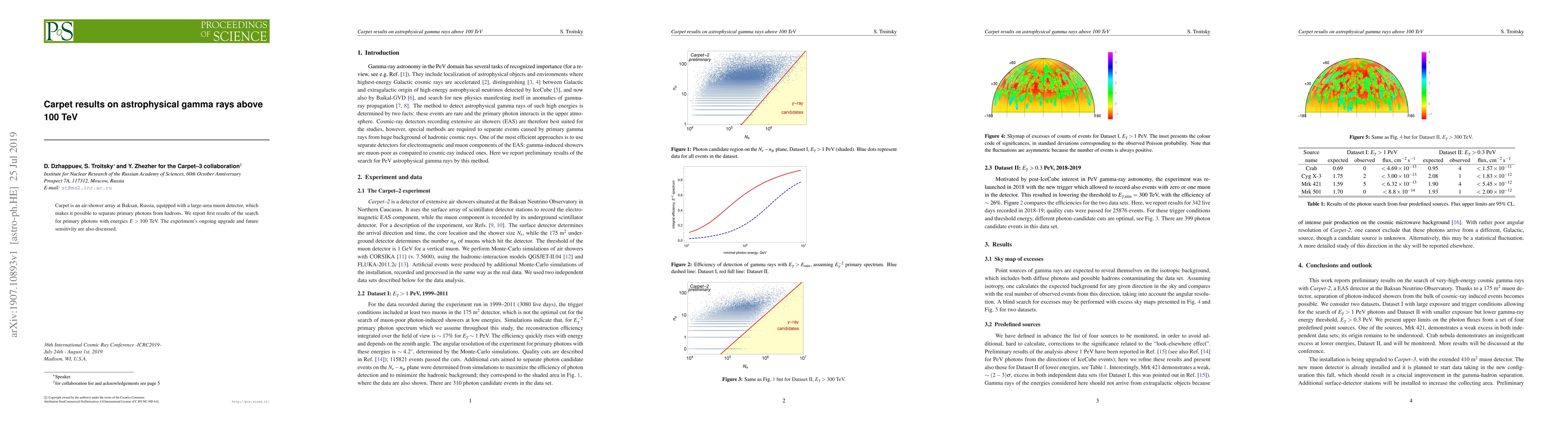 Carpet is an air-shower array at Baksan, Russia, equipped with a large-area muon detector, which makes it possible to separate primary photons from hadrons. We report first results of the search for primary photons with energies E>100 TeV. The experiment's ongoing upgrade and future sensitivity are also discussed.