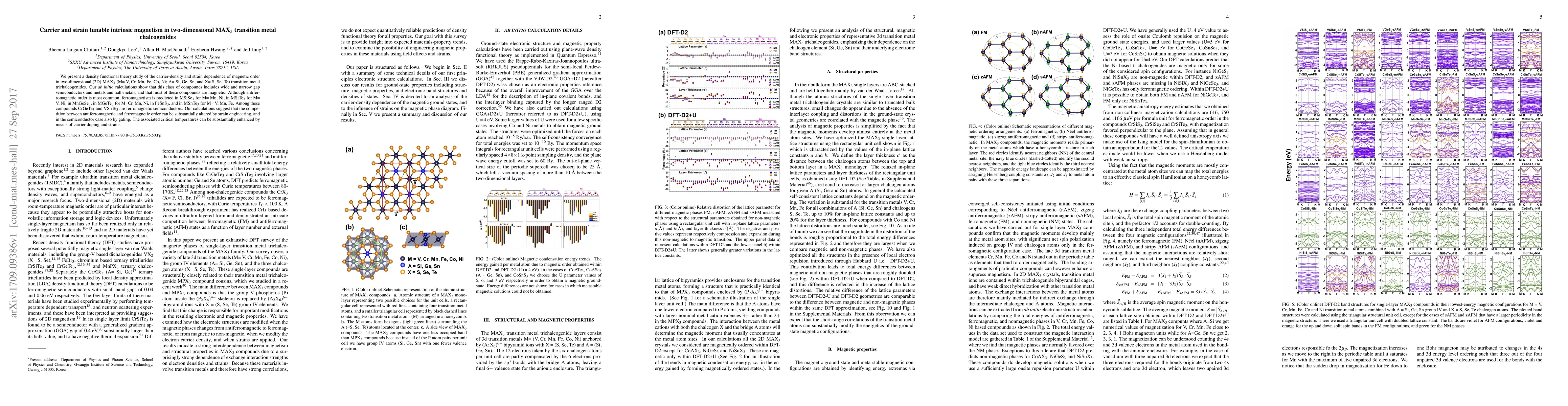 We present a density functional theory study of the carrier-density and strain dependence of magnetic order in two-dimensional (2D) MAX$_3$ (M= V, Cr, Mn, Fe, Co, Ni; A= Si, Ge, Sn, and X= S, Se, Te) transition metal trichalcogenides. Our {\em ab initio} calculations show that this class of compounds includes wide and narrow gap semiconductors and metals and half-metals, and that most of these compounds are magnetic. Although antiferromagnetic order is most common, ferromagnetism is predicted in MSiSe$_3$ for M= Mn, Ni, in MSiTe$_3$ for M= V, Ni, in MnGeSe$_3$, in MGeTe$_3$ for M=Cr, Mn, Ni, in FeSnS$_3$, and in MSnTe$_3$ for M= V, Mn, Fe. Among these compounds CrGeTe$_3$ and VSnTe$_3$ are ferromagnetic semiconductors. Our calculations suggest that the competition between antiferromagnetic and ferromagnetic order can be substantially altered by strain engineering, and in the semiconductor case also by gating. The associated critical temperatures can be substantially enhanced by means of carrier doping and strains.