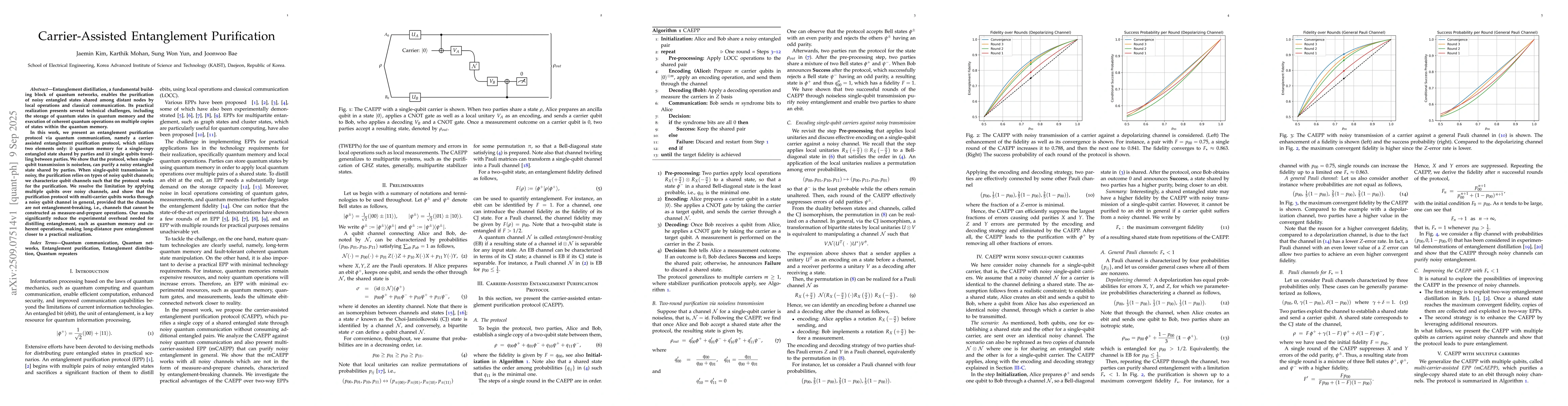 Entanglement distillation, a fundamental building block of quantum networks, enables the purification of noisy entangled states shared among distant nodes by local operations and classical communication. Its practical realization presents several technical challenges, including the storage of quantum states in quantum memory and the execution of coherent quantum operations on multiple copies of states within the quantum memory. In this work, we present an entanglement purification protocol via quantum communication, namely a carrier-assisted entanglement purification protocol, which utilizes two elements only: i) quantum memory for a single-copy entangled state shared by parties and ii) single qubits travelling between parties. We show that the protocol, when single-qubit transmission is noiseless, can purify a noisy entangled state shared by parties. When single-qubit transmission is noisy, the purification relies on types of noisy qubit channels; we characterize qubit channels such that the protocol works for the purification. We resolve the limitation by applying multiple qubits over noisy channels, and show that the purification protocol with multi-carrier qubits works through a noisy qubit channel in general, provided that the channels are not entanglement-breaking, i.e., channels that cannot be constructed as measure-and-prepare operations. Our results significantly reduce the experimental overhead needed for distilling entanglement, such as quantum memory and coherent operations, making long-distance pure entanglement closer to a practical realization.