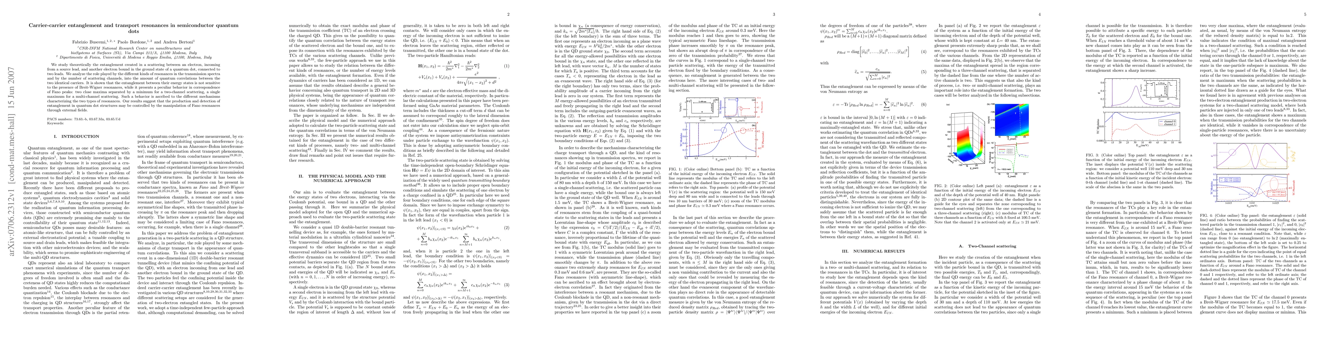 We study theoretically the entanglement created in a scattering between an electron, incoming from a source lead, and another electron bound in the ground state of a quantum dot, connected to two leads. We analyze the role played by the different kinds of resonances in the transmission spectra and by the number of scattering channels, into the amount of quantum correlations between the two identical carriers. It is shown that the entanglement between their energy states is not sensitive to the presence of Breit-Wigner resonances, while it presents a peculiar behavior in correspondence of Fano peaks: two close maxima separated by a minimum, for a two-channel scattering, a single maximum for a multi-channel scattering. Such a behavior is ascribed to the different mechanisms characterizing the two types of resonances. Our results suggest that the production and detection of entanglement in quantum dot structures may be controlled by the manipulation of Fano resonances through external fields.