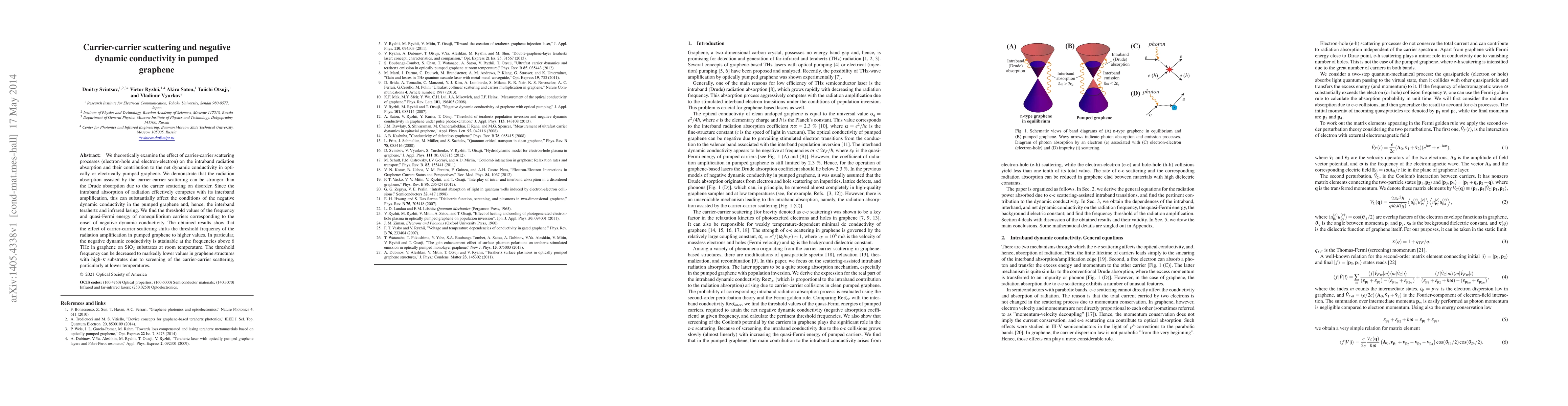 This paper explores how carrier-carrier scattering in graphene influences intraband radiation absorption and dynamic conductivity, revealing that it can lead to negative dynamic conductivity at frequencies above 6 THz, especially in graphene on SiO2 substrates, and can be reduced with high-k substrates.
