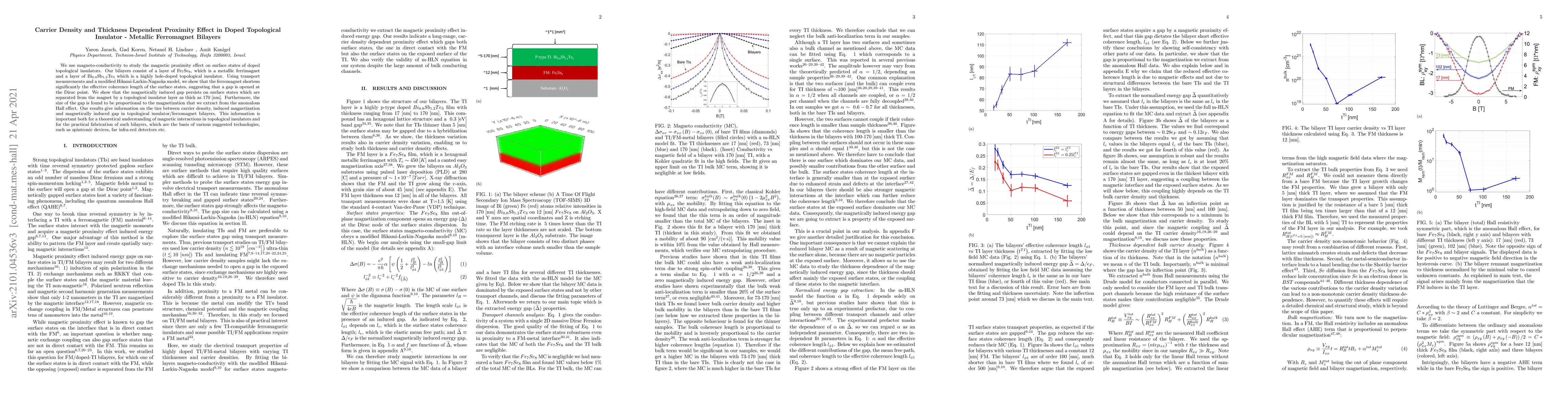 We use magneto-conductivity to study the magnetic proximity effect on surface states of doped topological insulators. Our bilayers consist of a layer of Fe$_7$Se$_8$, which is a metallic ferrimagnet and a layer of Bi$_{0.8}$Sb$_{1.2}$Te$_{3}$ which is a highly hole-doped topological insulator. Using transport measurements and a modified Hikami-Larkin-Nagaoka model, we show that the ferromagnet shortens significantly the effective coherence length of the surface states, suggesting that a gap is opened at the Dirac point. We show that the magnetically induced gap persists on surface states which are separated from the magnet by a topological insulator layer as thick as 170 [nm]. Furthermore, the size of the gap is found to be proportional to the magnetization that we extract from the anomalous Hall effect. Our results give information on the ties between carrier density, induced magnetization and magnetically induced gap in topological insulator/ferromagnet bilayers. This information is important both for a theoretical understanding of magnetic interactions in topological insulators and for the practical fabrication of such bilayers, which are the basis of various suggested technologies, such as spintronic devices, far infra-red detectors etc.