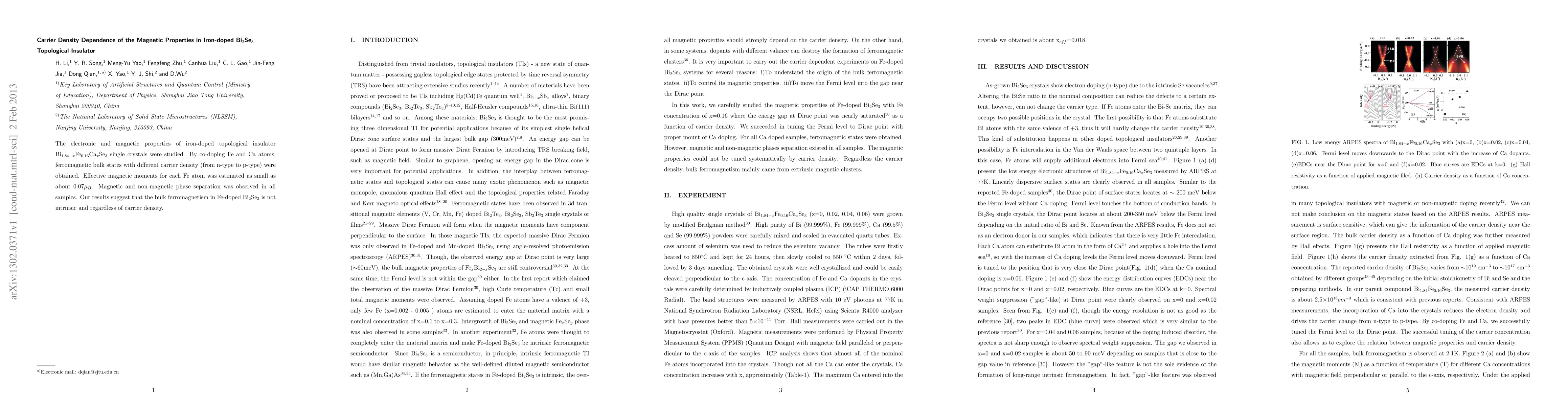 The electronic and magnetic properties of iron-doped topological insulator Bi1.84-xFe0.16CaxSe3 single crystals were studied. By co-doping Fe and Ca atoms, ferromagnetic bulk states with different carrier density (from n-type to p-type) were obtained. Effective magnetic moments for each Fe atom was estimated as small as about 0.07$\mu$B. Magnetic and non-magnetic phases separation was observed in all samples. Our results suggest that the bulk ferromagnetism in Fe-doped Bi2Se3 is not intrinsic and regardless of carrier density.