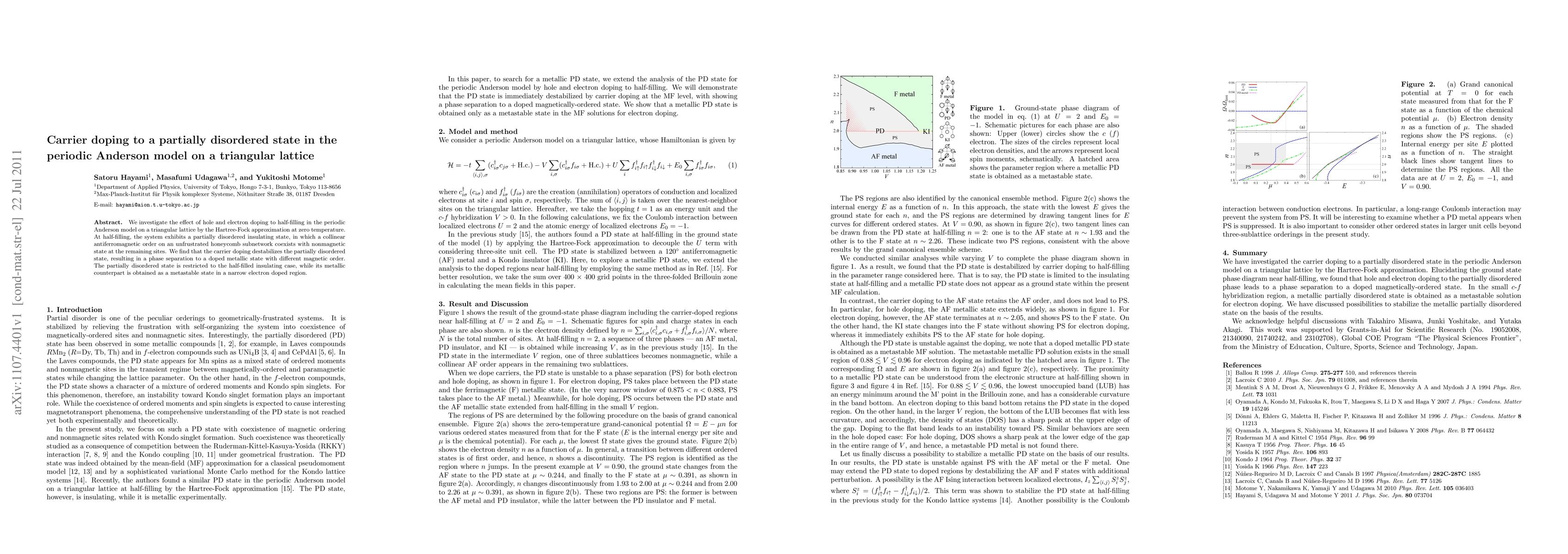 This paper explores the impact of hole and electron doping on the periodic Anderson model on a triangular lattice, revealing that doping destabilizes the partially disordered insulating state, leading to phase separation into a metallic state with distinct magnetic order. The partially disordered state is exclusive to the half-filled condition, while its metallic variant emerges metastably in a narrow electron-doped region.