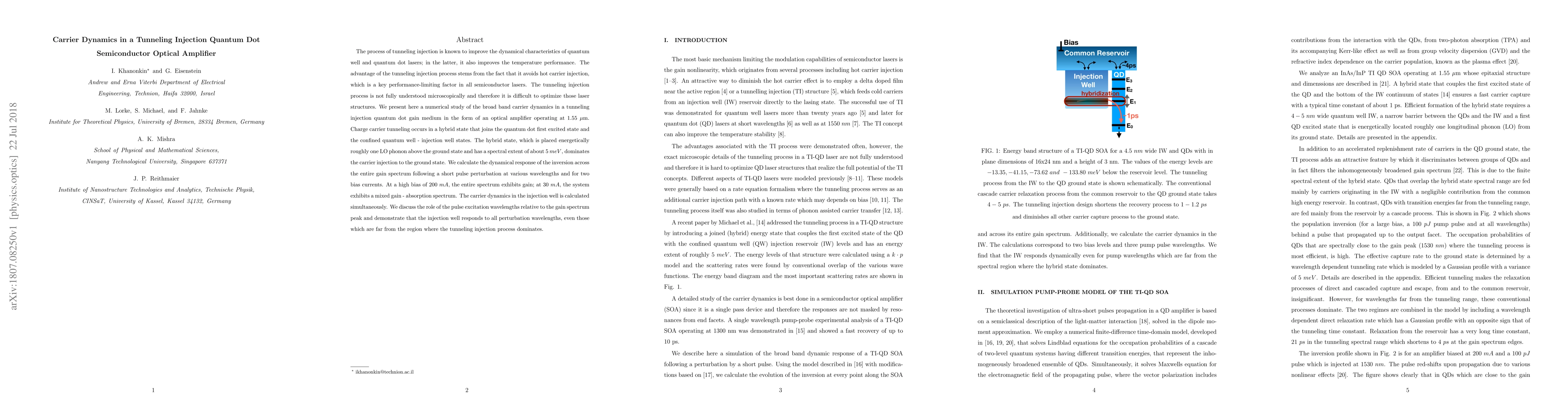 The process of tunneling injection is known to improve the dynamical characteristics of quantum well and quantum dot lasers; in the latter, it also improves the temperature performance. The advantage of the tunneling injection process stems from the fact that it avoids hot carrier injection, which is a key performance-limiting factor in all semiconductor lasers. The tunneling injection process is not fully understood microscopically and therefore it is difficult to optimize those laser structures. We present here a numerical study of the broad band carrier dynamics in a tunneling injection quantum dot gain medium in the form of an optical amplifier operating at 1.55 um. Charge carrier tunneling occurs in a hybrid state that joins the quantum dot first excited state and the confined quantum well - injection well states. The hybrid state, which is placed energetically roughly one LO phonon above the ground state and has a spectral extent of about 5 meV , dominates the carrier injection to the ground state. We calculate the dynamical response of the inversion across the entire gain spectrum following a short pulse perturbation at various wavelengths and for two bias currents. At a high bias of 200 mA, the entire spectrum exhibits gain; at 30 mA, the system exhibits a mixed gain - absorption spectrum. The carrier dynamics in the injection well is calculated simultaneously. We discuss the role of the pulse excitation wavelengths relative to the gain spectrum peak and demonstrate that the injection well responds to all perturbation wavelengths, even those which are far from the region where the tunneling injection process dominates.