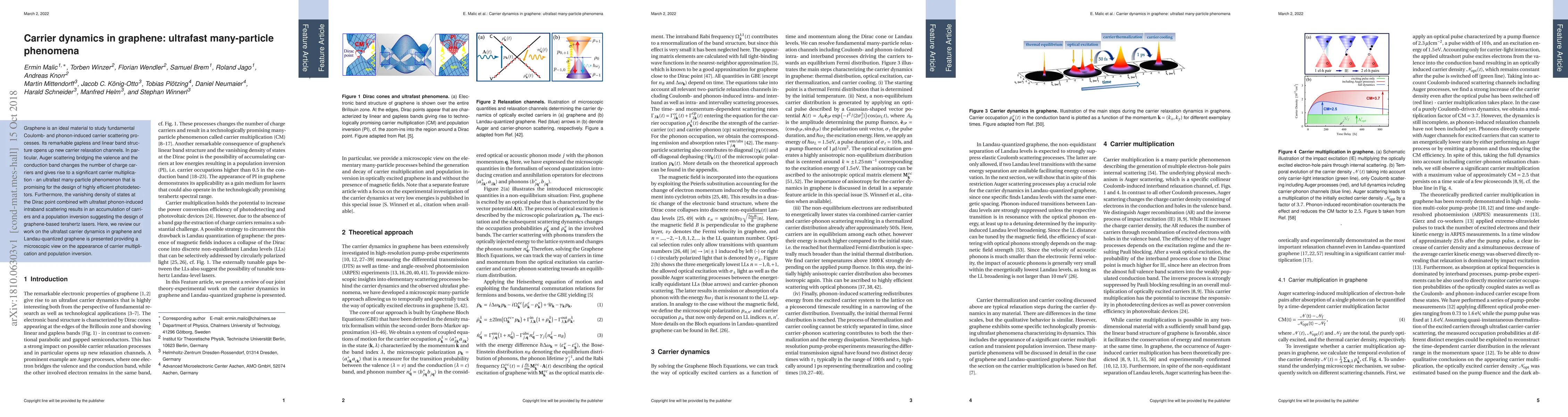 This paper reviews ultrafast carrier dynamics in graphene, focusing on phenomena such as Auger scattering leading to carrier multiplication and phonon-induced intraband scattering resulting in population inversion, which are pivotal for the development of efficient photodetectors and terahertz lasers.