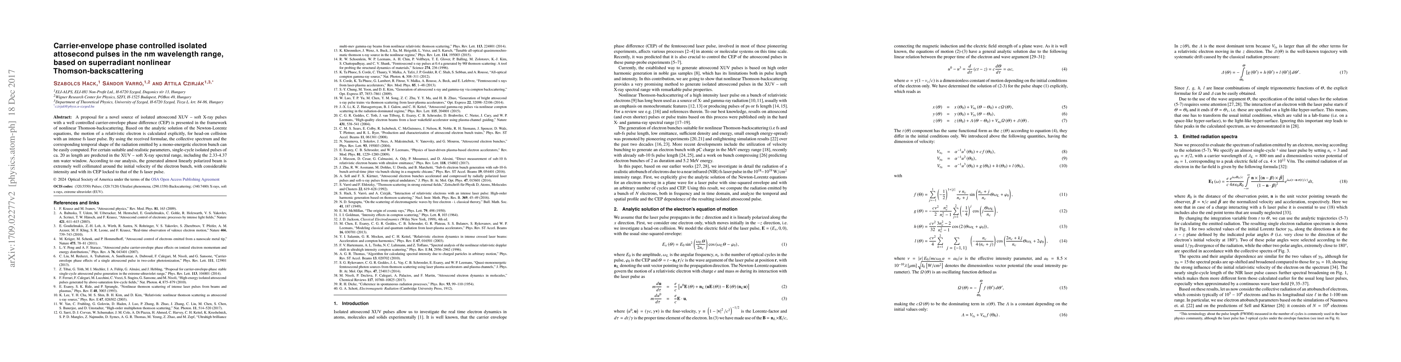 A proposal for a novel source of isolated attosecond XUV -- soft X-ray pulses with a well controlled carrier-envelope phase difference (CEP) is presented in the framework of nonlinear Thomson-backscattering. Based on the analytic solution of the Newton-Lorentz equations, the motion of a relativistic electron is calculated explicitly, for head-on collision with an intense fs laser pulse. By using the received formulae, the collective spectrum and the corresponding temporal shape of the radiation emitted by a mono-energetic electron bunch can be easily computed. For certain suitable and realistic parameters, single-cycle isolated pulses of ca. 20 as length are predicted in the XUV -- soft X-ray spectral range, including the 2.33-4.37 nm water window. According to our analysis, the generated almost linearly polarized beam is extremely well collimated around the initial velocity of the electron bunch, with considerable intensity and with its CEP locked to that of the fs laser pulse.
