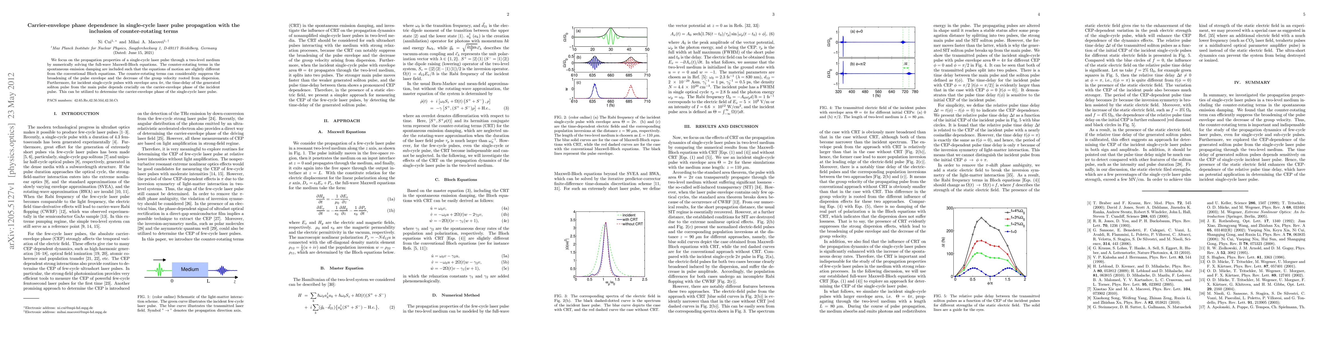 This paper investigates the propagation of single-cycle laser pulses through a two-level medium, incorporating counter-rotating terms in the Maxwell-Bloch equations to suppress pulse envelope broadening and group velocity decrease. It finds that the carrier-envelope phase significantly affects the time-delay of soliton pulses, enabling the determination of this phase.