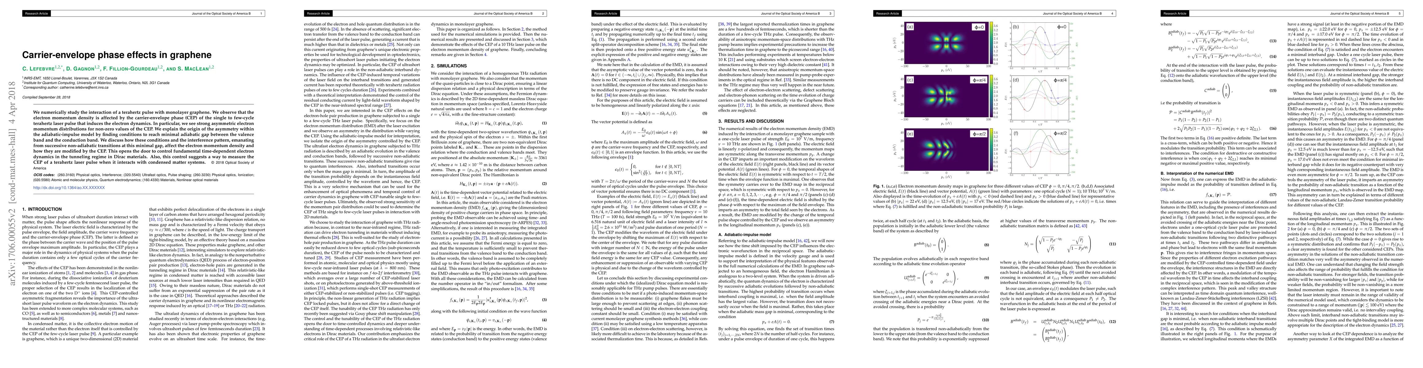 We numerically study the interaction of a terahertz pulse with monolayer graphene. We observe that the electron momentum density is affected by the carrier-envelope phase (CEP) of the single- to few-cycle terahertz laser pulse that induces the electron dynamics. In particular, we see strong asymmetric electron momentum distributions for non-zero values of the CEP. We explain the origin of the asymmetry within the adiabatic-impulse model by finding conditions to reach minimal adiabatic gap between the valence band and the conduction band. We discuss how these conditions and the interference pattern, emanating from successive non-adiabatic transitions at this minimal gap, affect the electron momentum density and how they are modified by the CEP. This opens the door to control fundamental time-dependent electron dynamics in the tunneling regime in Dirac materials. Also, this control suggests a way to measure the CEP of a terahertz laser pulse when it interacts with condensed matter systems.