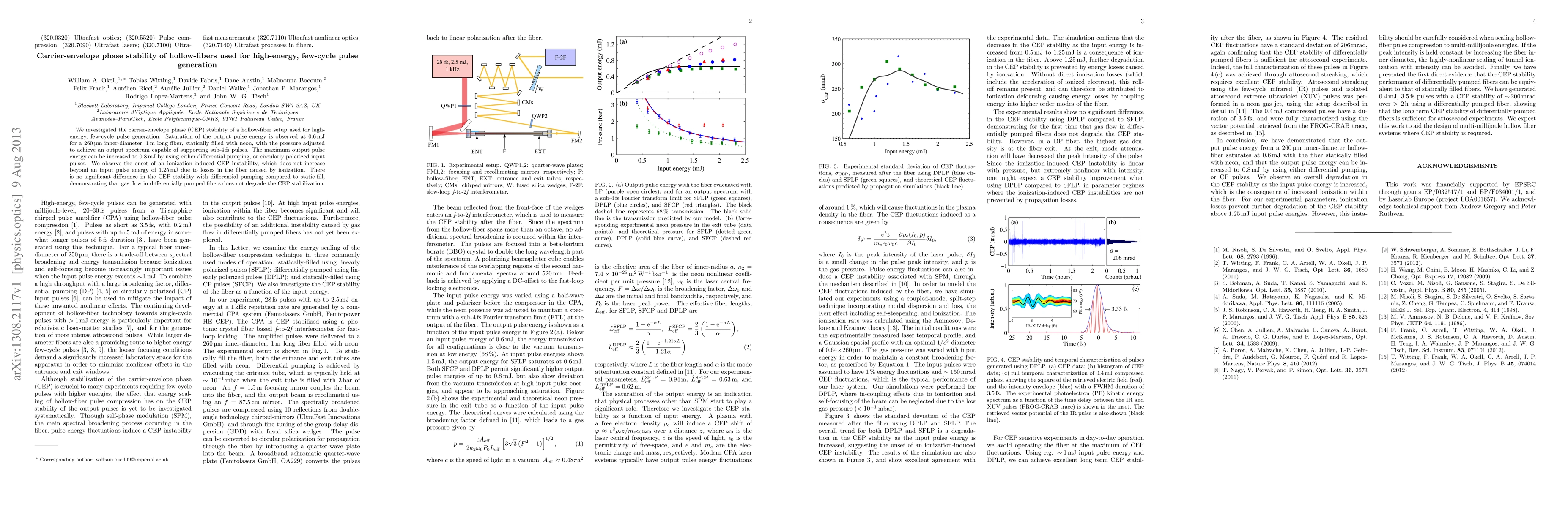 We investigated the carrier-envelope phase (CEP) stability of a hollow-fiber setup used for high-energy, few-cycle pulse generation. Saturation of the output pulse energy is observed at 0.6 mJ for a 260 um inner-diameter, 1 m long fiber, statically filled with neon, with the pressure adjusted to achieve an output spectrum capable of supporting sub-4fs pulses. The maximum output pulse energy can be increased to 0.8mJ by using either differential pumping, or circularly polarized input pulses. We observe the onset of an ionization-induced CEP instability, which does not increase beyond an input pulse energy of 1.25 mJ due to losses in the fiber caused by ionization. There is no significant difference in the CEP stability with differential pumping compared to static-fill, demonstrating that gas flow in differentially pumped fibers does not degrade the CEP stabilization.