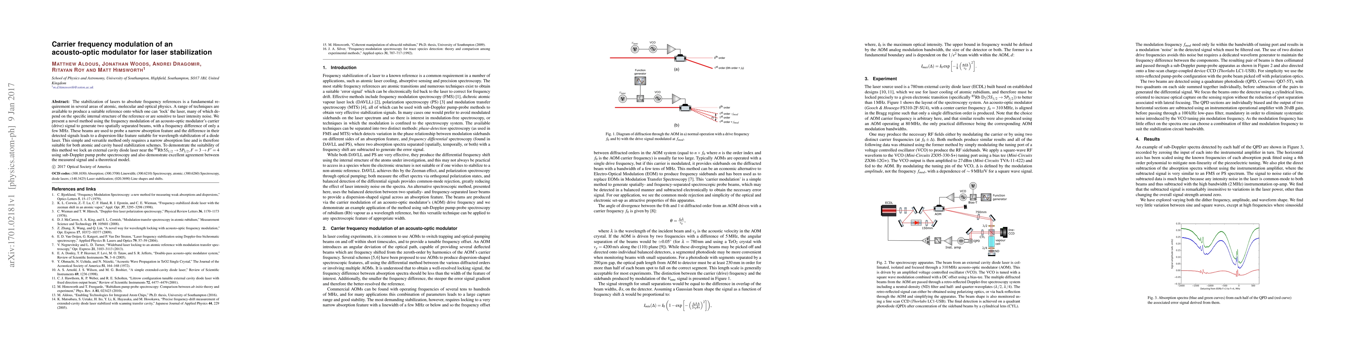 The stabilization of lasers to absolute frequency references is a fundamental requirement in several areas of atomic, molecular and optical physics. A range of techniques are available to produce a suitable reference onto which one can 'lock' the laser, many of which depend on the specific internal structure of the reference or are sensitive to laser intensity noise. We present a novel method using the frequency modulation of an acousto-optic modulator's carrier (drive) signal to generate two spatially separated beams, with a frequency difference of only a few MHz. These beams are used to probe a narrow absorption feature and the difference in their detected signals leads to a dispersion-like feature suitable for wavelength stabilization of a diode laser. This simple and versatile method only requires a narrow absorption line and is therefore suitable for both atomic and cavity based stabilization schemes. To demonstrate the suitability of this method we lock an external cavity diode laser near the $^{85}\mathrm{Rb}\,5S_{1/2}\rightarrow5P_{3/2}, F=3\rightarrow F^{\prime}=4$ using sub-Doppler pump probe spectroscopy and also demonstrate excellent agreement between the measured signal and a theoretical model.