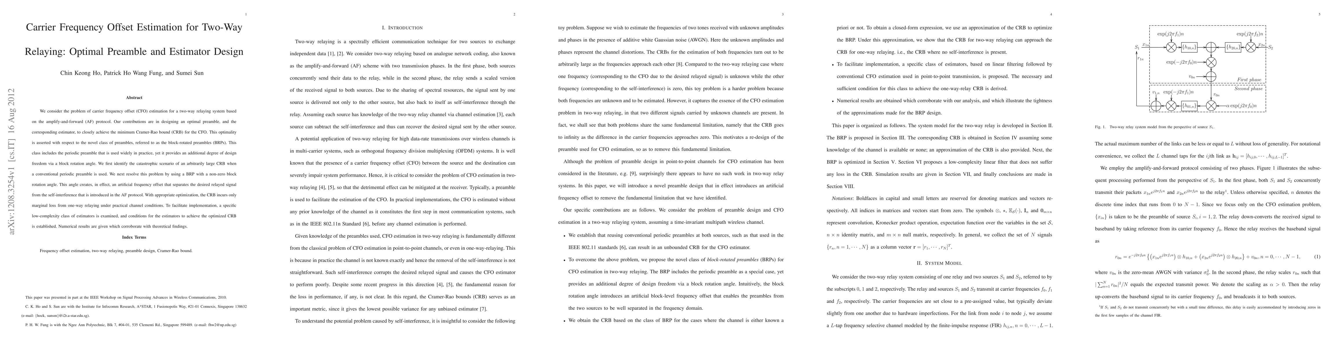 We consider the problem of carrier frequency offset (CFO) estimation for a two-way relaying system based on the amplify-and-forward (AF) protocol. Our contributions are in designing an optimal preamble, and the corresponding estimator, to closely achieve the minimum Cramer-Rao bound (CRB) for the CFO. This optimality is asserted with respect to the novel class of preambles, referred to as the block-rotated preambles (BRPs). This class includes the periodic preamble that is used widely in practice, yet it provides an additional degree of design freedom via a block rotation angle. We first identify the catastrophic scenario of an arbitrarily large CRB when a conventional periodic preamble is used. We next resolve this problem by using a BRP with a non-zero block rotation angle. This angle creates, in effect, an artificial frequency offset that separates the desired relayed signal from the self-interference that is introduced in the AF protocol. With appropriate optimization, the CRB incurs only marginal loss from one-way relaying under practical channel conditions. To facilitate implementation, a specific low-complexity class of estimators is examined, and conditions for the estimators to achieve the optimized CRB is established. Numerical results are given which corroborate with theoretical findings.