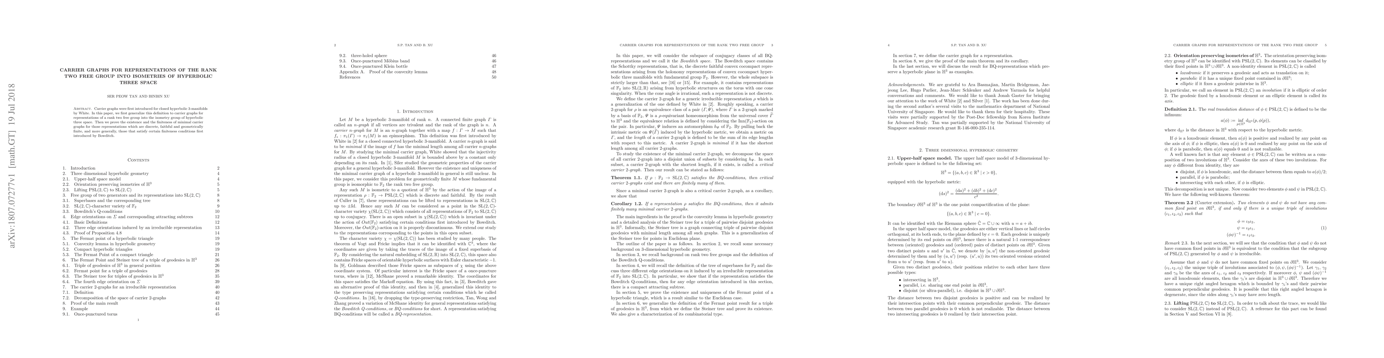 This paper generalizes the concept of carrier graphs to representations of a rank two free group into isometries of hyperbolic three space, proving the existence and finiteness of minimal carrier graphs for discrete, faithful, and geometrically finite representations.
