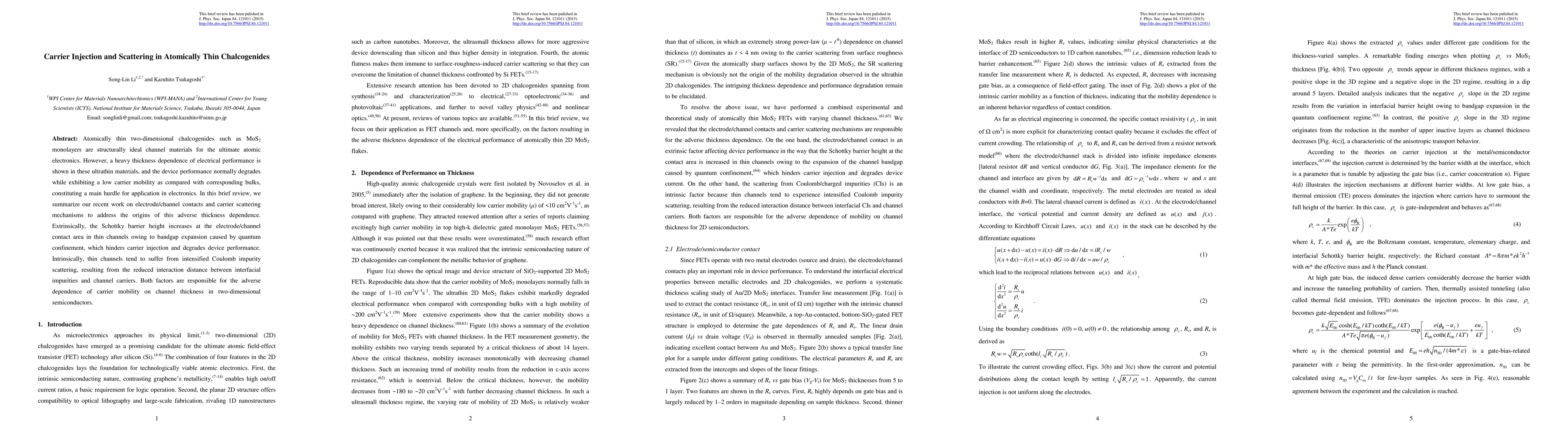This paper reviews the adverse thickness dependence in atomically thin chalcogenides like MoS2, attributing it to increased Schottky barrier heights and intensified Coulomb impurity scattering, which hinder carrier injection and degrade device performance. Both extrinsic and intrinsic factors affect carrier mobility in these ultrathin materials.