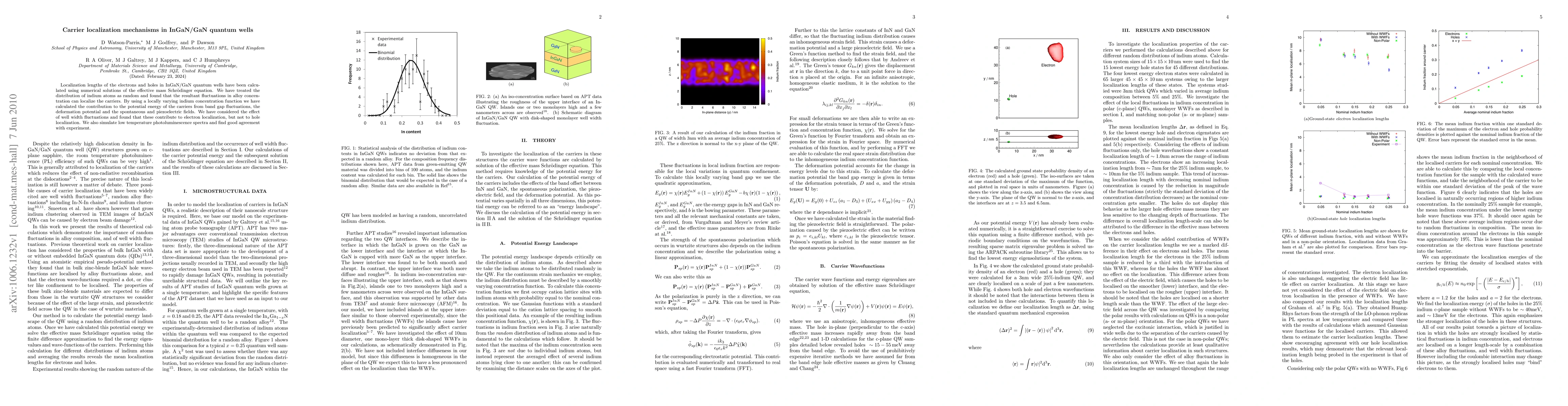 This paper investigates carrier localization in InGaN/GaN quantum wells through numerical solutions of the effective mass Schrödinger equation, revealing that fluctuations in alloy concentration due to random indium distribution can localize carriers. It also finds that well width fluctuations contribute to electron but not hole localization, and simulates low temperature photoluminescence spectra with experimental agreement.