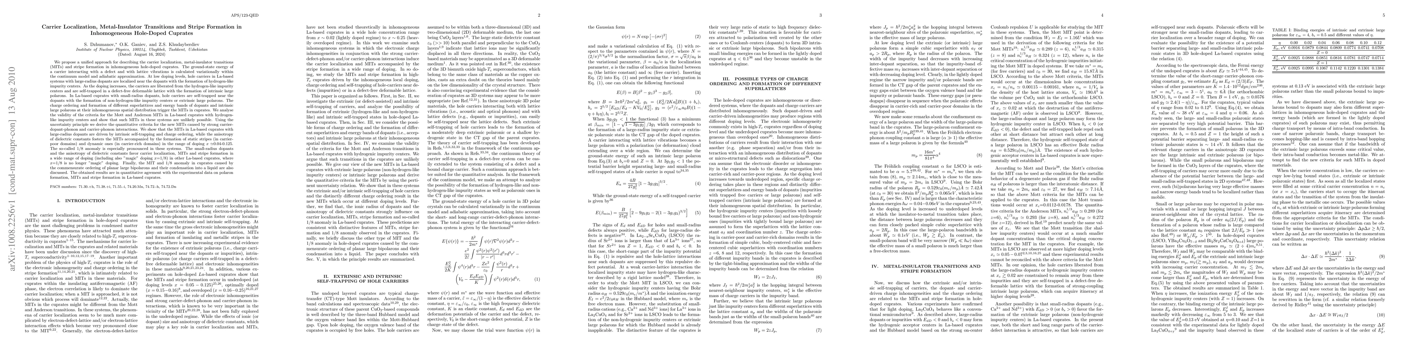 This paper proposes a unified framework to explain carrier localization, metal-insulator transitions, and stripe formation in hole-doped cuprates. It calculates the ground-state energy of a carrier interacting with defects and lattice vibrations, revealing that at low doping, hole carriers localize near large-radius dopants, forming hydrogenic impurity centers.