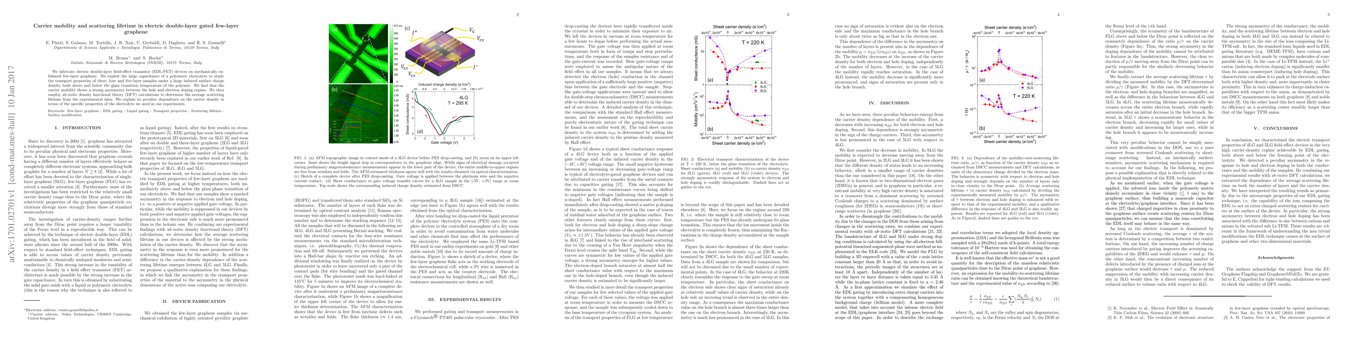 This study fabricates EDL-FET devices on few-layer graphene and finds strong asymmetry in carrier mobility between hole and electron doping regimes. Using DFT calculations, the researchers determine the scattering lifetime's dependence on carrier density, attributing it to the unique properties of the polymeric electrolyte used.