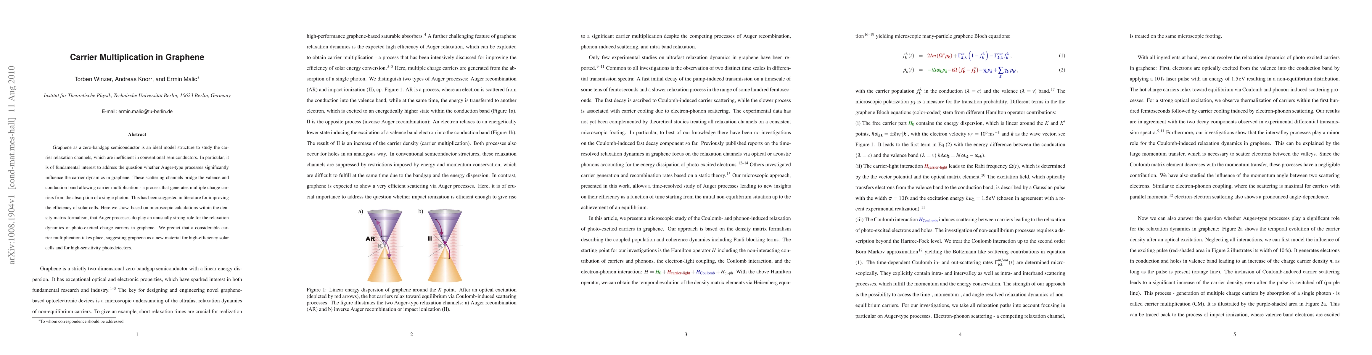 This research demonstrates that Auger processes significantly influence the relaxation dynamics of photo-excited charge carriers in graphene, leading to substantial carrier multiplication. These findings propose graphene as a potential material for improving solar cell efficiency and developing high-sensitivity photodetectors.