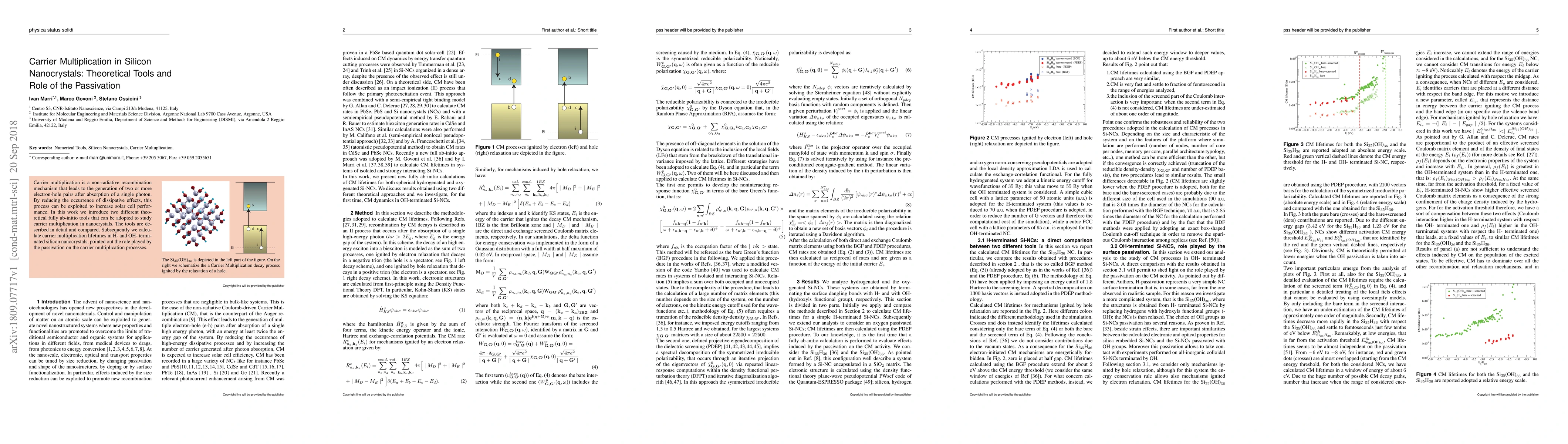 This paper introduces two theoretical ab-initio tools for studying carrier multiplication in silicon nanocrystals, comparing their methodologies. It investigates the impact of H- and OH- passivation on carrier multiplication lifetimes, highlighting the role of passivation in enhancing solar cell performance.