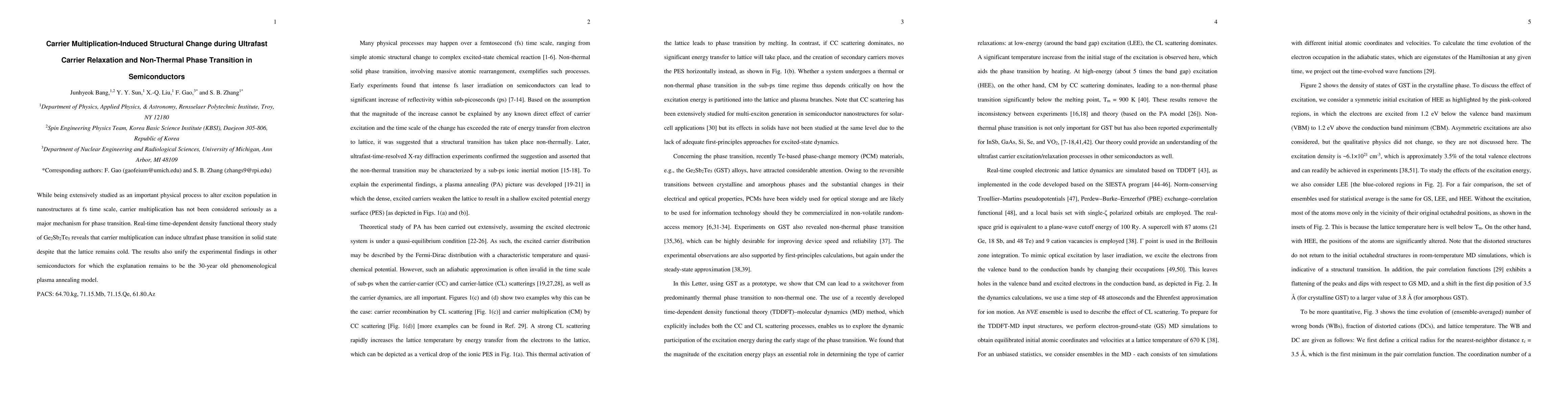 While being extensively studied as an important physical process to alter exciton population in nanostructures at fs time scale, carrier multiplication has not been considered seriously as a major mechanism for phase transition. Real-time time-dependent density functional theory study of Ge2Sb2Te5 reveals that carrier multiplication can induce ultrafast phase transition in solid state despite that the lattice remains cold. The results also unify the experimental findings in other semiconductors for which the explanation remains to be the 30-year old phenomenological plasma annealing model.