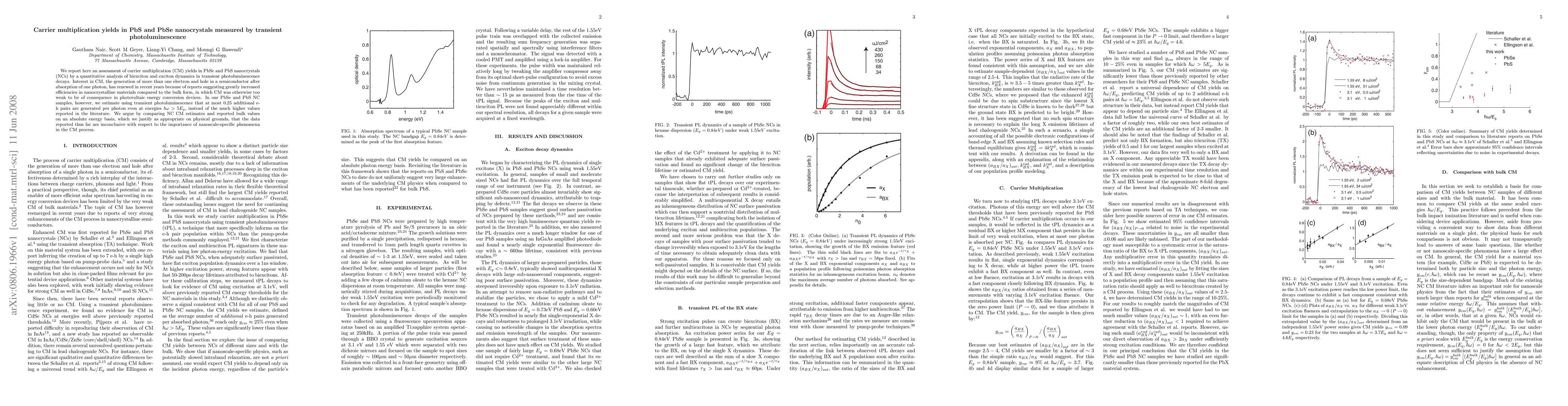 This study quantitatively analyzes carrier multiplication in PbSe and PbS nanocrystals using transient photoluminescence, finding that only 0.25 additional electron-hole pairs are generated per photon, challenging previous claims of significantly higher efficiencies in nanocrystalline materials. The authors argue that reported data remain inconclusive regarding nanoscale-specific phenomena in carrier multiplication.