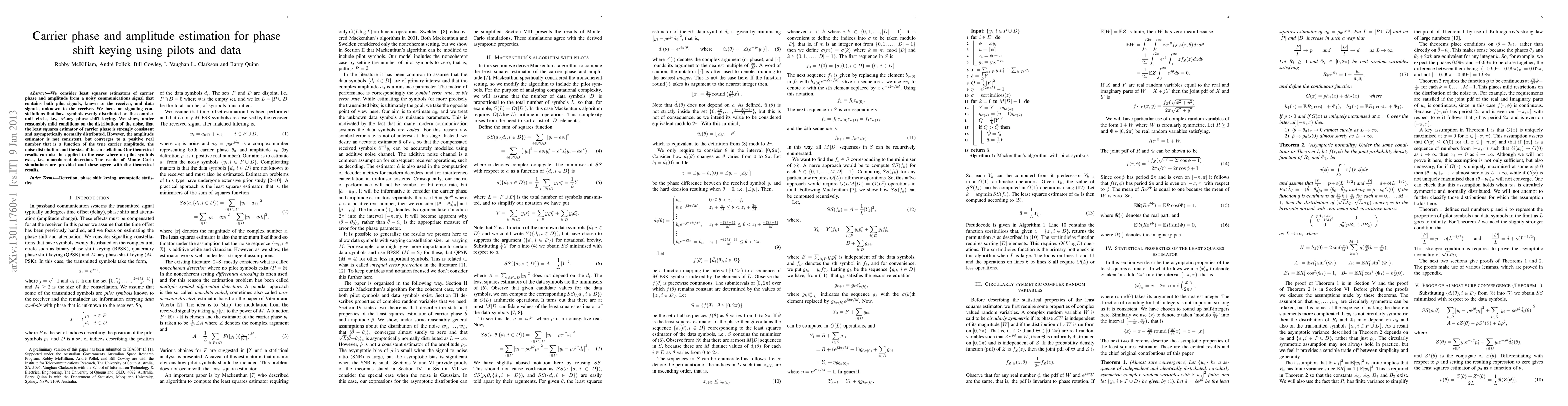 The paper investigates phase shift keying estimation with pilots and data in noisy communications signals, showing that carrier phase estimators converge asymptotically to a normal distribution but amplitude estimators do not converge consistently.