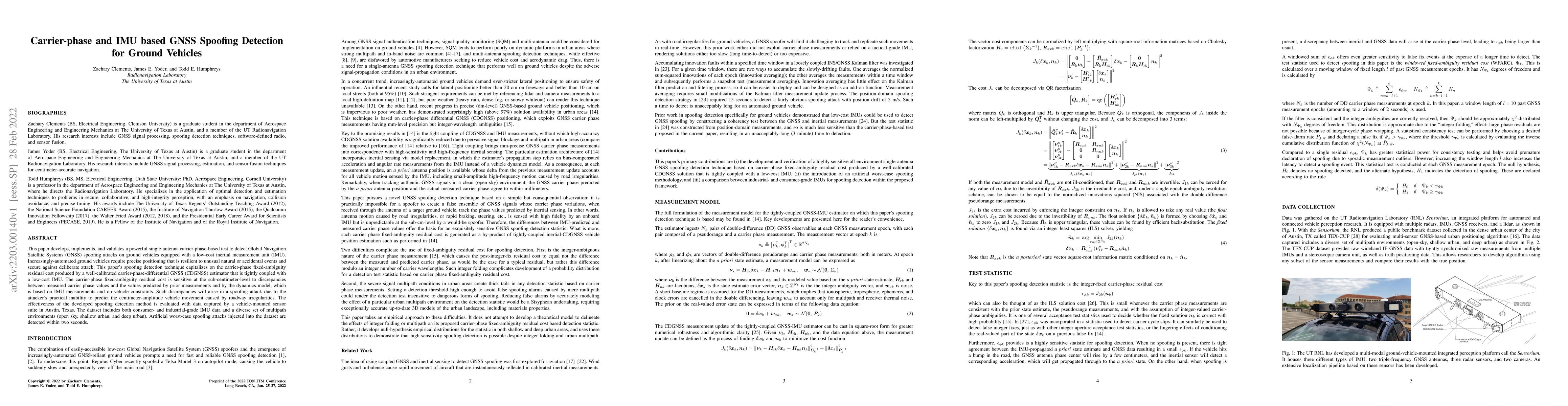 This paper presents a carrier-phase-based method for detecting GNSS spoofing attacks on ground vehicles using a low-cost IMU, showing high sensitivity to discrepancies caused by spoofing. The technique successfully identifies spoofing within two seconds using data from various environments in Austin, Texas.