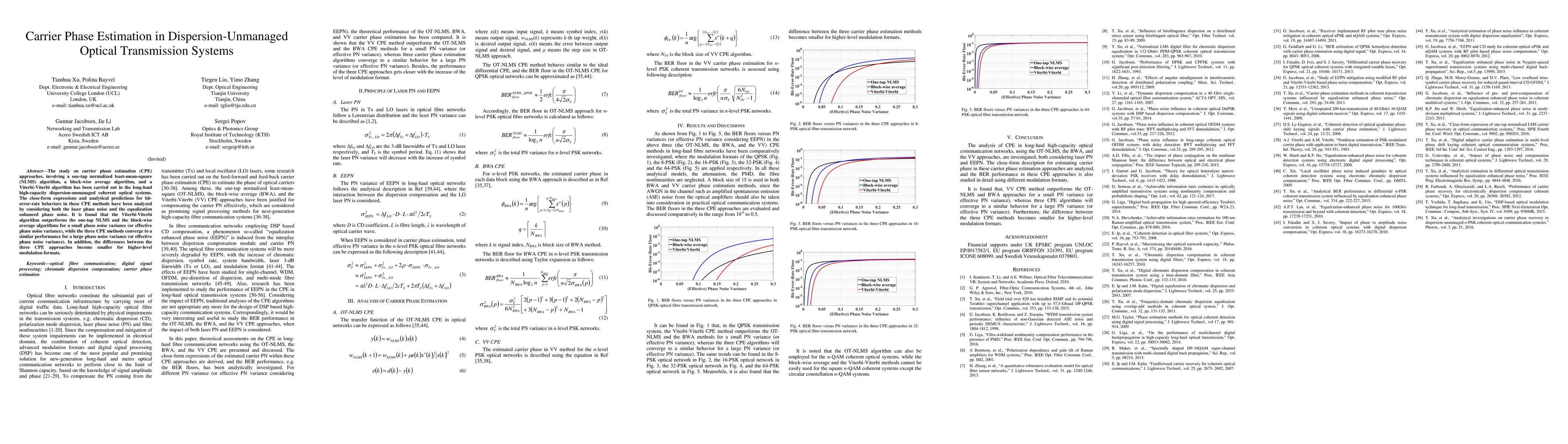 This paper evaluates carrier phase estimation (CPE) techniques in dispersion-unmanaged optical systems, finding that the Viterbi-Viterbi algorithm excels under low phase noise, while all methods converge in high phase noise conditions. Higher-level modulations diminish the performance differences among the CPE methods.