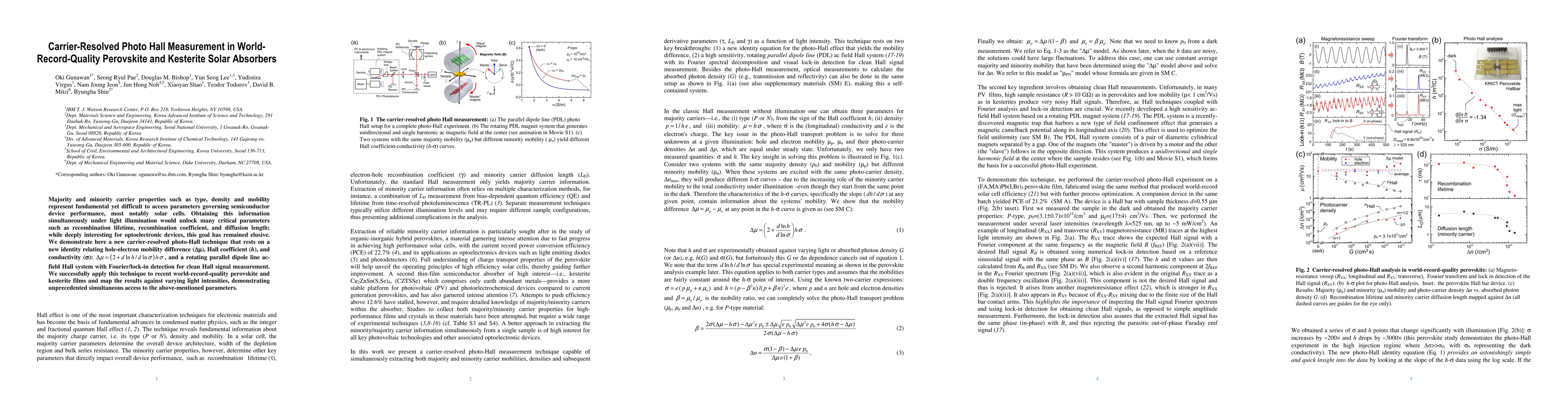 Majority and minority carrier properties such as type, density and mobility represent fundamental yet difficult to access parameters governing semiconductor device performance, most notably solar cells. Obtaining this information simultaneously under light illumination would unlock many critical parameters such as recombination lifetime, recombination coefficient, and diffusion length; while deeply interesting for optoelectronic devices, this goal has remained elusive. We demonstrate here a new carrier-resolved photo-Hall technique that rests on a new identity relating hole-electron mobility difference ($\Delta\mu$), Hall coefficient ($h$), and conductivity ($\sigma$): $\Delta\mu=(2+d\ln h/d\ln \sigma)\,h\,\sigma$, and a rotating parallel dipole line ac-field Hall system with Fourier/lock-in detection for clean Hall signal measurement. We successfully apply this technique to recent world-record-quality perovskite and kesterite films and map the results against varying light intensities, demonstrating unprecedented simultaneous access to the above-mentioned parameters.