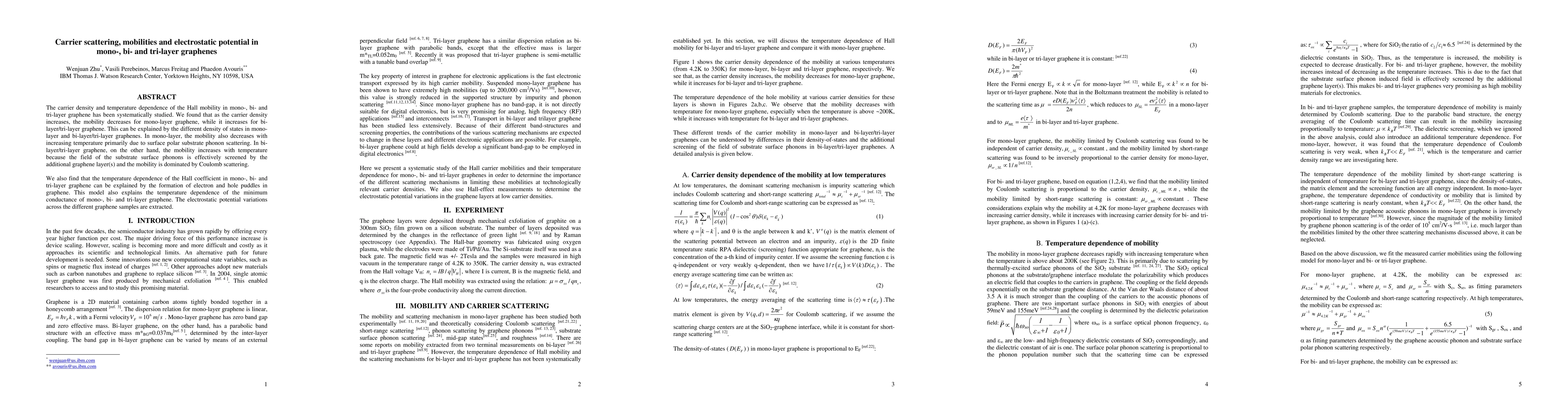 The carrier density and temperature dependence of the Hall mobility in mono-, bi- and tri-layer graphene has been systematically studied. We found that as the carrier density increases, the mobility decreases for mono-layer graphene, while it increases for bi-layer/tri-layer graphene. This can be explained by the different density of states in mono-layer and bi-layer/tri-layer graphenes. In mono-layer, the mobility also decreases with increasing temperature primarily due to surface polar substrate phonon scattering. In bi-layer/tri-layer graphene, on the other hand, the mobility increases with temperature because the field of the substrate surface phonons is effectively screened by the additional graphene layer(s) and the mobility is dominated by Coulomb scattering. We also find that the temperature dependence of the Hall coefficient in mono-, bi- and tri-layer graphene can be explained by the formation of electron and hole puddles in graphene. This model also explains the temperature dependence of the minimum conductance of mono-, bi- and tri-layer graphene. The electrostatic potential variations across the different graphene samples are extracted.