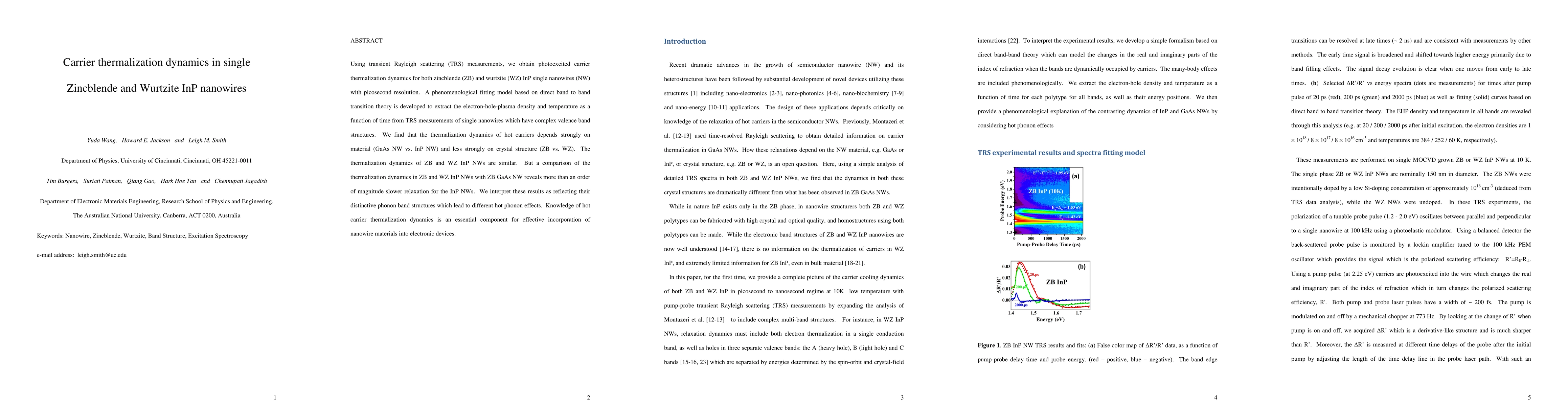 Using transient Rayleigh scattering (TRS) measurements, we obtain photoexcited carrier thermalization dynamics for both zincblende (ZB) and wurtzite (WZ) InP single nanowires (NW) with picosecond resolution. A phenomenological fitting model based on direct band to band transition theory is developed to extract the electron-hole-plasma density and temperature as a function of time from TRS measurements of single nanowires which have complex valence band structures. We find that the thermalization dynamics of hot carriers depends strongly on material (GaAs NW vs. InP NW) and less strongly on crystal structure (ZB vs. WZ). The thermalization dynamics of ZB and WZ InP NWs are similar. But a comparison of the thermalization dynamics in ZB and WZ InP NWs with ZB GaAs NW reveals more than an order of magnitude slower relaxation for the InP NWs. We interpret these results as reflecting their distinctive phonon band structures which lead to different hot phonon effects. Knowledge of hot carrier thermalization dynamics is an essential component for effective incorporation of nanowire materials into electronic devices.