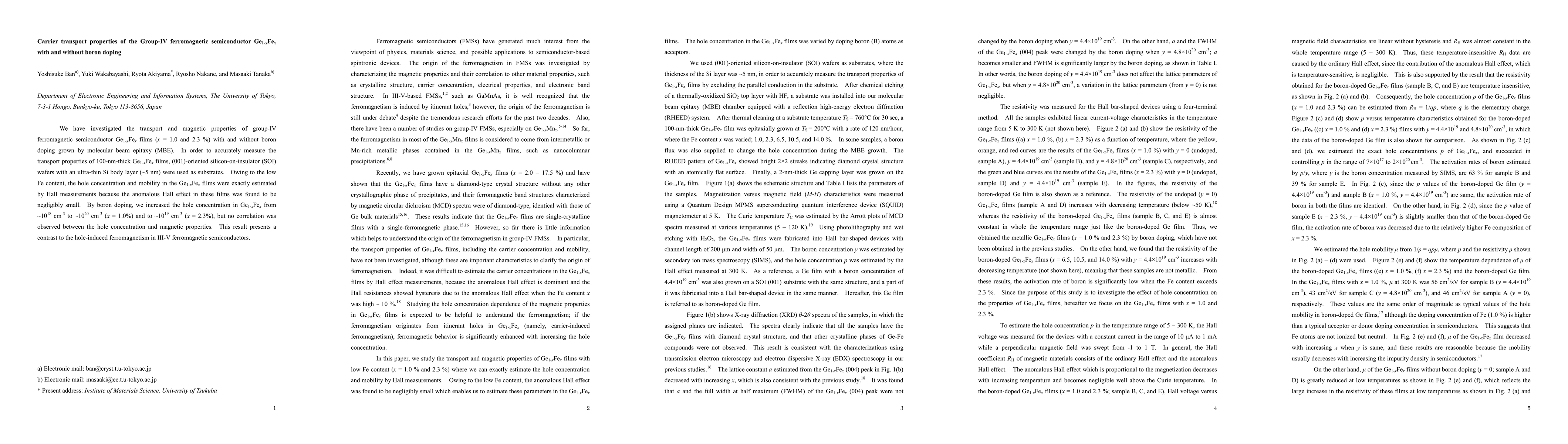 This paper investigates the carrier transport and magnetic properties of Ge1-xFex films, showing that boron doping significantly increases hole concentration but does not correlate with magnetic properties, contrasting with III-V ferromagnetic semiconductors.