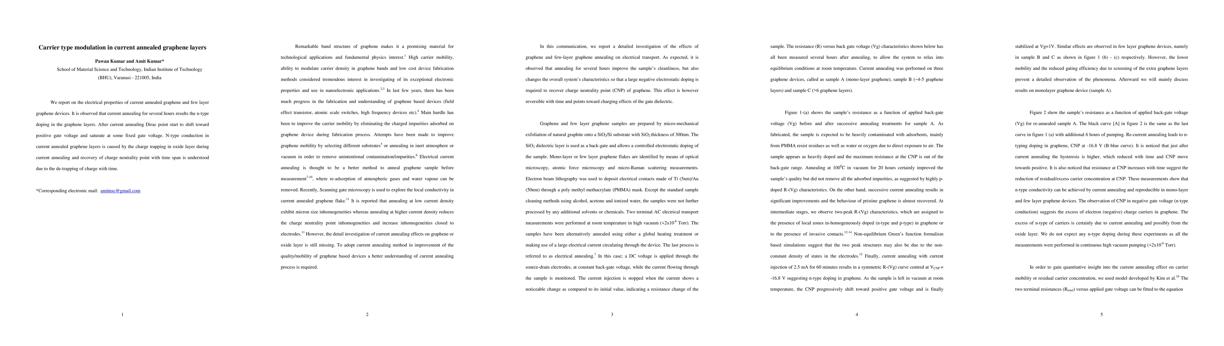 We report on the electrical properties of current annealed graphene and few layer graphene devices. It is observed that current annealing for several hours results the n-type doping in the graphene layers. After current annealing Dirac point start to shift toward positive gate voltage and saturate at some fixed gate voltage. N-type conduction in current annealed graphene layers is caused by the charge trapping in oxide layer during current annealing and recovery of charge neutrality point with time span is understood due to the de-trapping of charge with time.