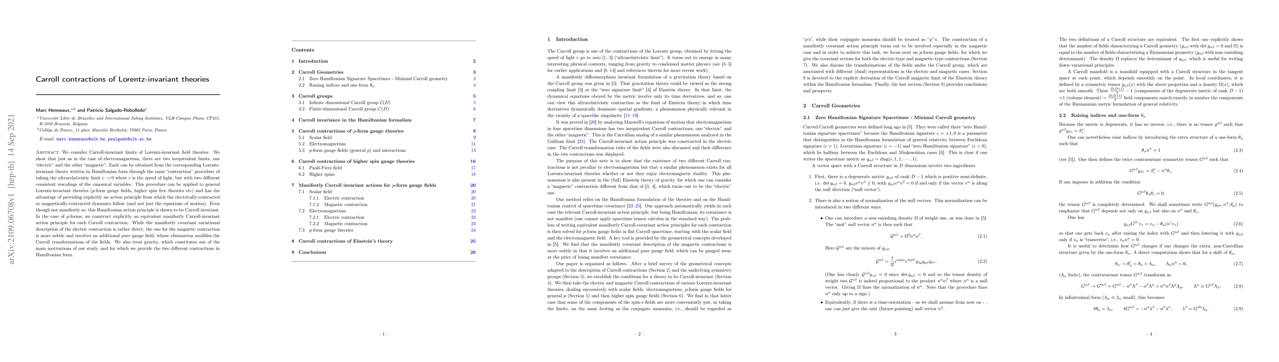 We consider Carroll-invariant limits of Lorentz-invariant field theories. We show that just as in the case of electromagnetism, there are two inequivalent limits, one "electric" and the other "magnetic". Each can be obtained from the corresponding Lorentz-invariant theory written in Hamiltonian form through the same "contraction" procedure of taking the ultrarelativistic limit $c \rightarrow 0$ where $c$ is the speed of light, but with two different consistent rescalings of the canonical variables. This procedure can be applied to general Lorentz-invariant theories ($p$-form gauge fields, higher spin free theories etc) and has the advantage of providing explicitly an action principle from which the electrically-contracted or magnetically-contracted dynamics follow (and not just the equations of motion). Even though not manifestly so, this Hamiltonian action principle is shown to be Carroll invariant. In the case of $p$-forms, we construct explicitly an equivalent manifestly Carroll-invariant action principle for each Carroll contraction. While the manifestly covariant variational description of the electric contraction is rather direct, the one for the magnetic contraction is more subtle and involves an additional pure gauge field, whose elimination modifies the Carroll transformations of the fields. We also treat gravity, which constitutes one of the main motivations of our study, and for which we provide the two different contractions in Hamiltonian form.
