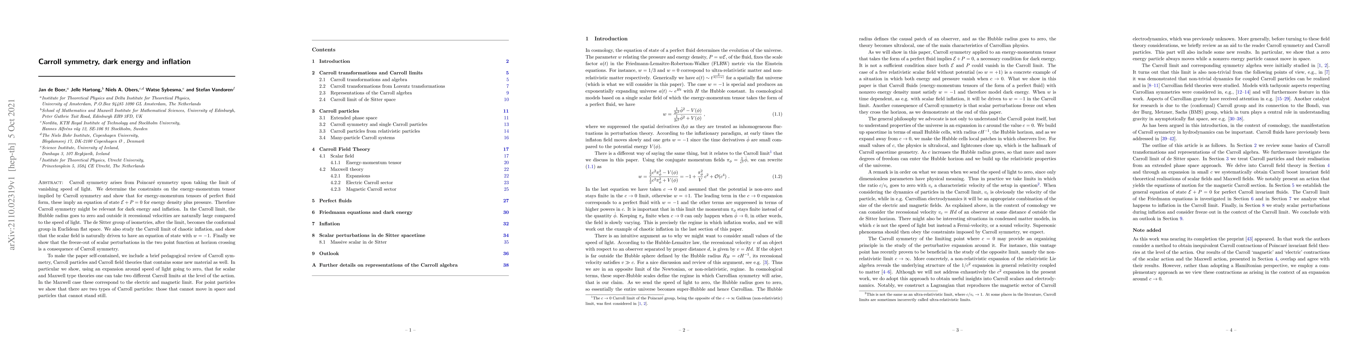This paper explores Carroll symmetry, revealing it imposes an equation of state ${cal E}+P=0$ for perfect fluids, potentially applicable to dark energy and inflation. It shows that in the Carroll limit, scalar field equations of state naturally approach $w=-1$, characteristic of dark energy. The study also demonstrates that Carroll symmetry explains the freeze-out of scalar perturbations in the two-point function at horizon crossing. The paper includes a pedagogical review of Carroll symmetry, Carroll particles, and Carroll field theories, introducing new insights into Carroll limits for scalar and Maxwell theories.