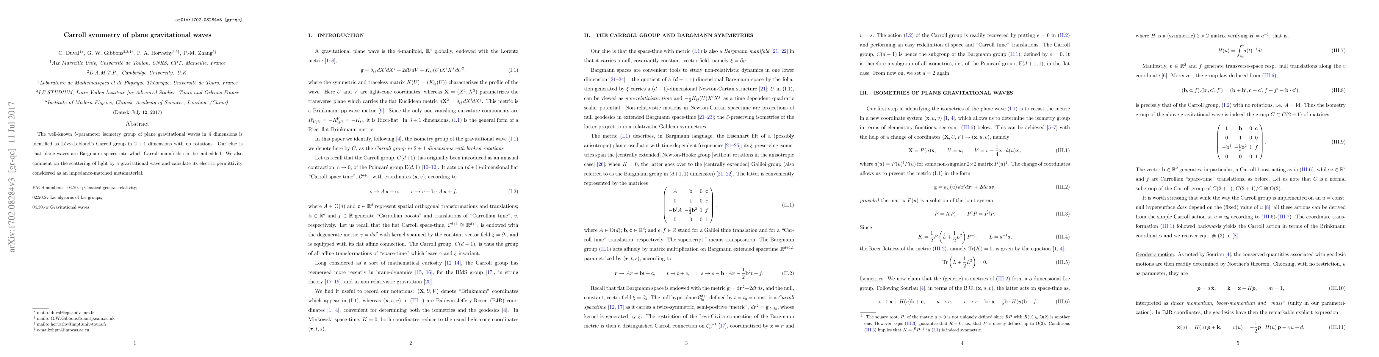 This research identifies the 5-parameter isometry group of plane gravitational waves as Carroll symmetry in $2+1$ dimensions without rotations, linking them to Bargmann spaces. Additionally, it explores the scattering of light by gravitational waves, treating them as impedance-matched metamaterials.