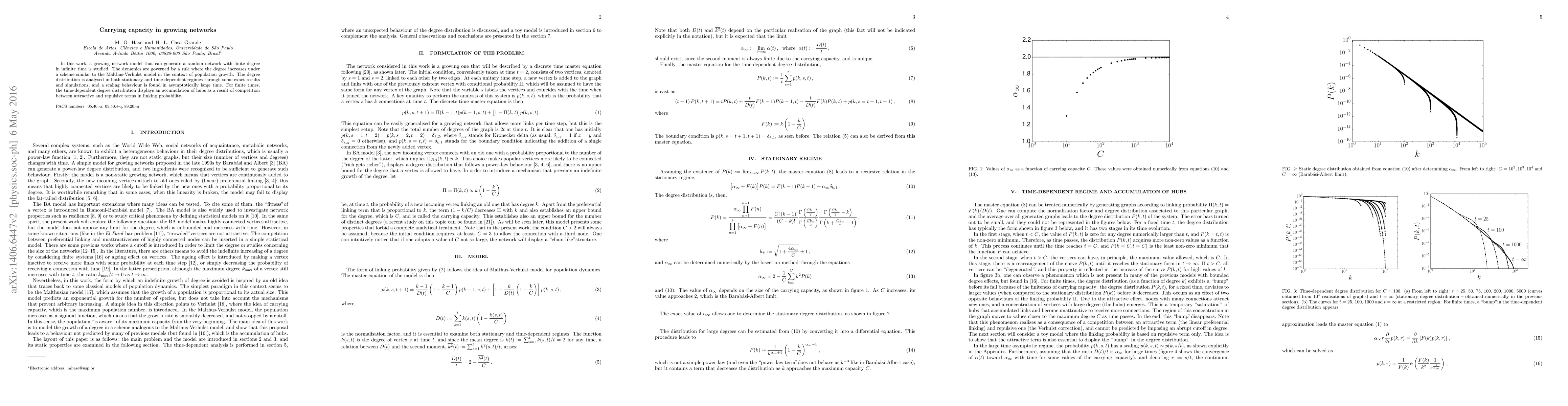 In this work, a growing network model that can generate a random network with finite degree in infinite time is studied. The dynamics are governed by a rule where the degree increases under a scheme similar to the Malthus-Verhulst model in the context of population growth. The degree distribution is analysed in both stationary and time-dependent regimes through some exact results and simulations, and a scaling behaviour is found in asymptotically large time. For finite times, the time-dependent degree distribution displays an accumulation of hubs as a result of competition between attractive and repulsive terms in linking probability.