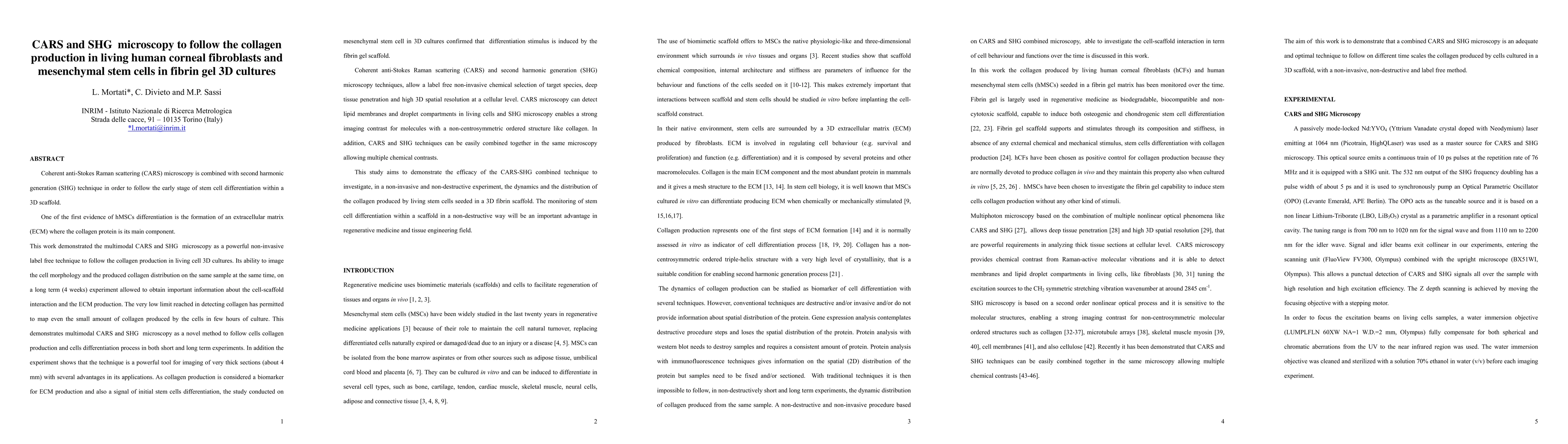 This study combines CARS and SHG microscopy to non-invasively track collagen production in living human corneal fibroblasts and mesenchymal stem cells in 3D fibrin gel cultures. The technique provides detailed imaging of cell morphology and collagen distribution over 4 weeks, revealing insights into cell-scaffold interactions and ECM production, highlighting its potential in regenerative medicine and tissue engineering.