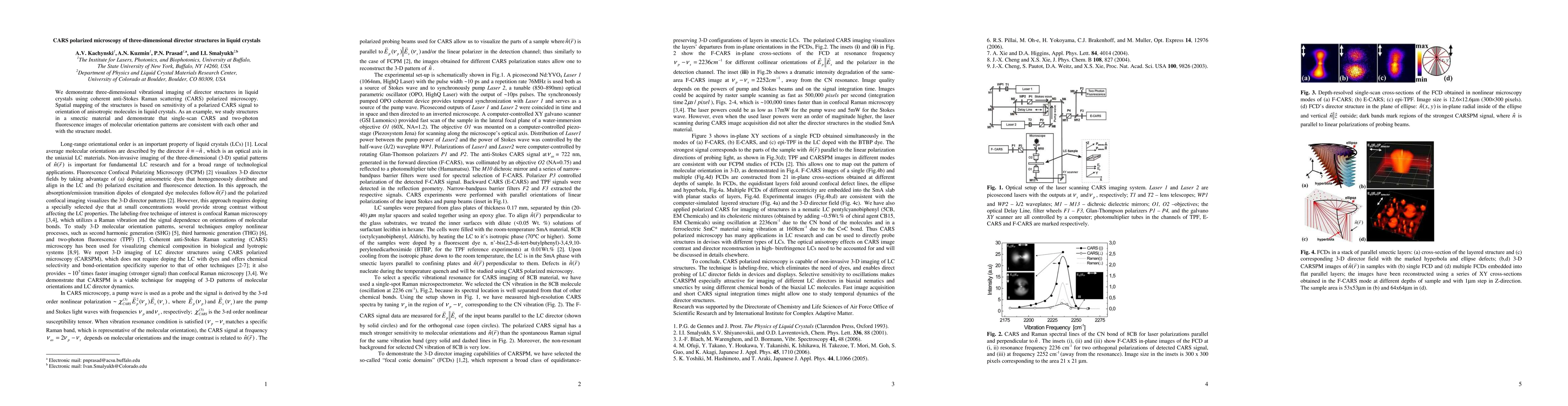 This paper presents a method for three-dimensional imaging of director structures in liquid crystals using CARS polarized microscopy, demonstrating its effectiveness through the study of a smectic material, showing consistent results with single-scan CARS and two-photon fluorescence imaging.