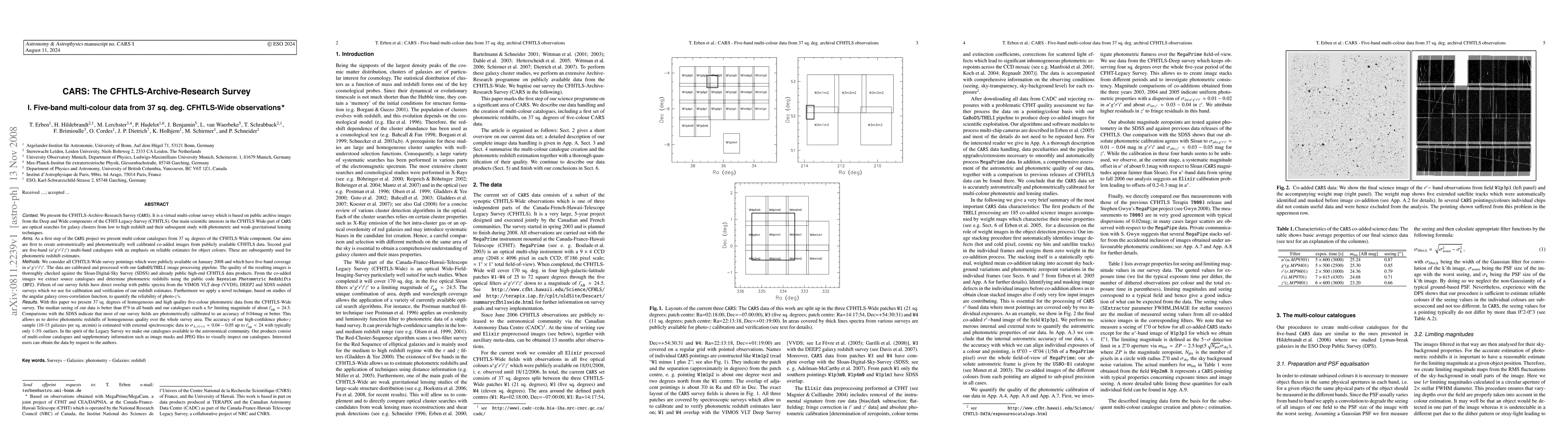 The CARS project presents a multi-colour survey based on CFHTLS-Wide data, focusing on galaxy cluster searches and studies using photometric and weak-gravitational lensing techniques. The survey provides five-band catalogues with reliable colour estimates and photometric redshifts, achieving high accuracy with a $\sigma_{\Delta_z/(1+z)}$ of 0.04-0.05 for high-confidence samples.
