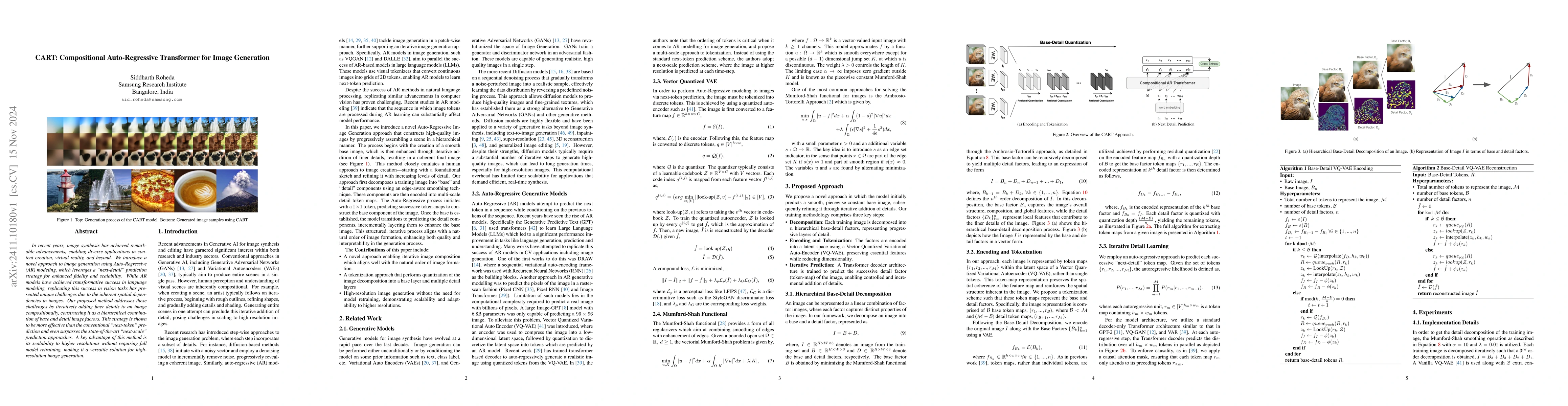 The CART model introduces an Auto-Regressive approach for image generation that iteratively adds finer details compositionally, outperforming traditional next-token prediction methods and achieving state-of-the-art results while remaining scalable to high resolutions.