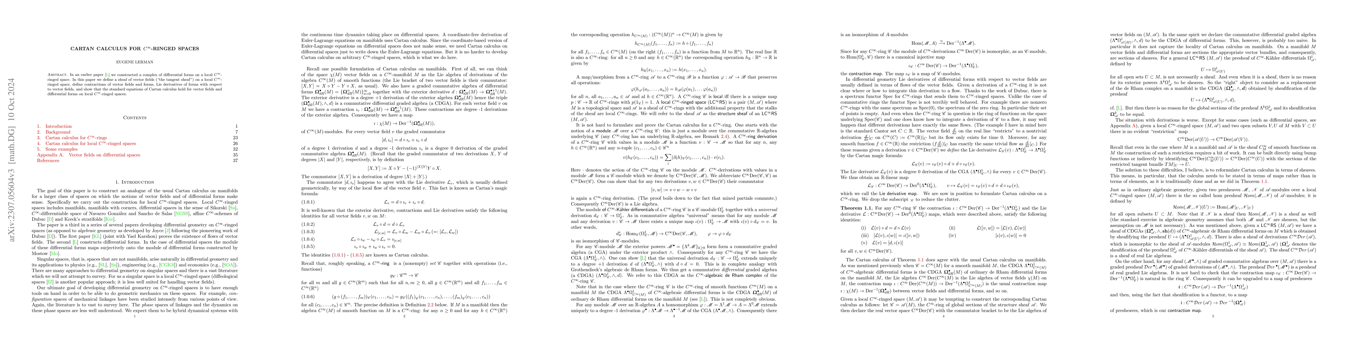 This paper extends the construction of a differential forms complex on local $C^\infty$-ringed spaces by defining a tangent sheaf, vector field contractions, and Lie derivatives, ultimately demonstrating that the foundational equations of Cartan calculus apply in this context.