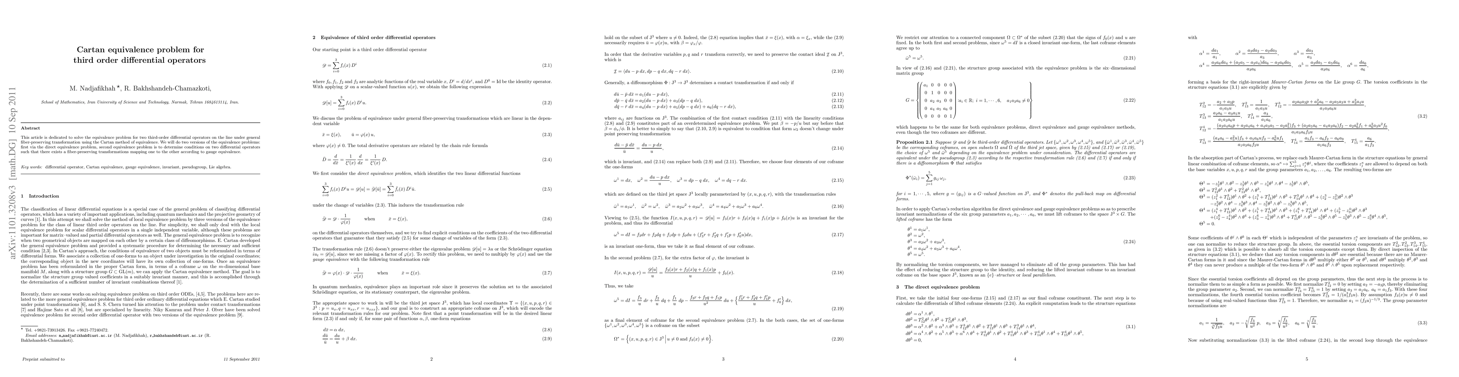 Summary: This research addresses the Cartan equivalence problem for two third-order differential operators on the line, employing the Cartan method. It explores three equivalence scenarios: direct equivalence, and gauge equivalence via fiber-preserving transformations.