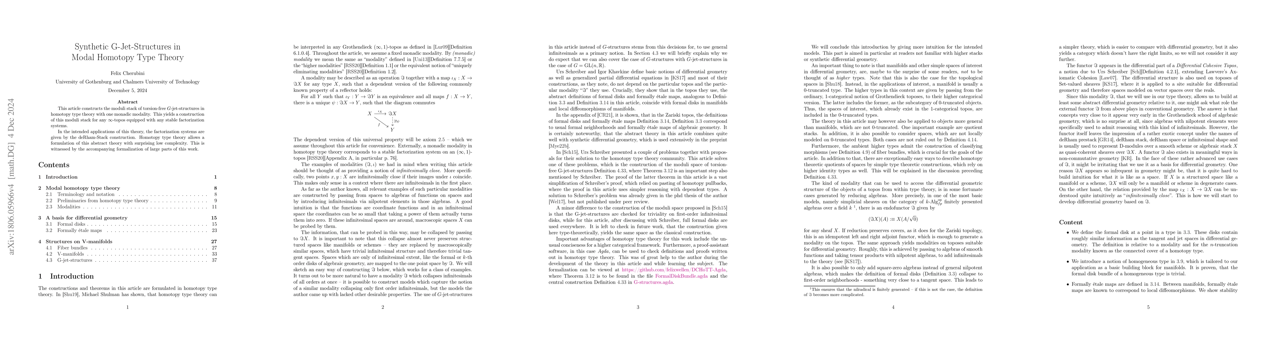 This article constructs the moduli stack of torsionfree $G$-structures in homotopy type theory with one monadic modality. This yields a construction of this moduli stack for any $\infty$-topos equipped with any stable factorization systems. In the intended applications of this theory, the factorization systems are given by the deRham-Stack construction. Homotopy type theory allows a formulation of this abstract theory with surprising low complexity. This is witnessed by the accompanying formalization of large parts of this work.