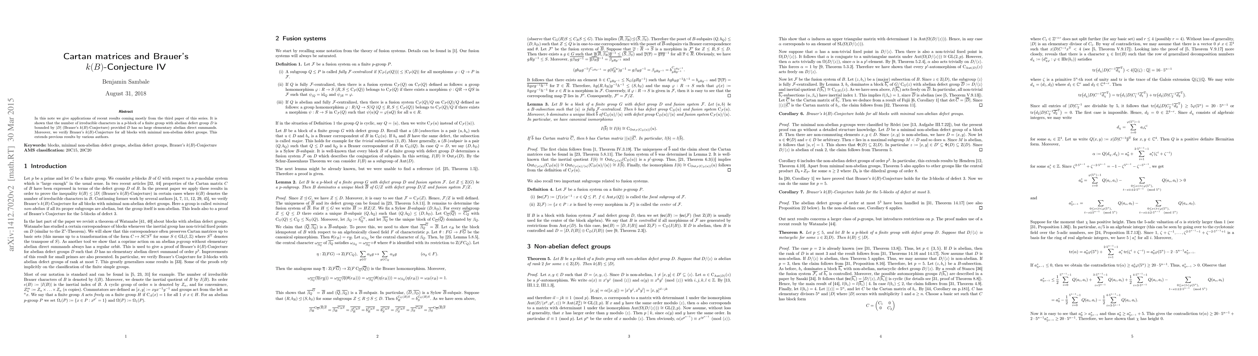 In this note we give applications of recent results coming mostly from the third paper of this series. It is shown that the number of irreducible characters in a $p$-block of a finite group with abelian defect group $D$ is bounded by $|D|$ (Brauer's $k(B)$-Conjecture) provided $D$ has no large elementary abelian direct summands. Moreover, we verify Brauer's $k(B)$-Conjecture for all blocks with minimal non-abelian defect groups. This extends previous results by various authors.