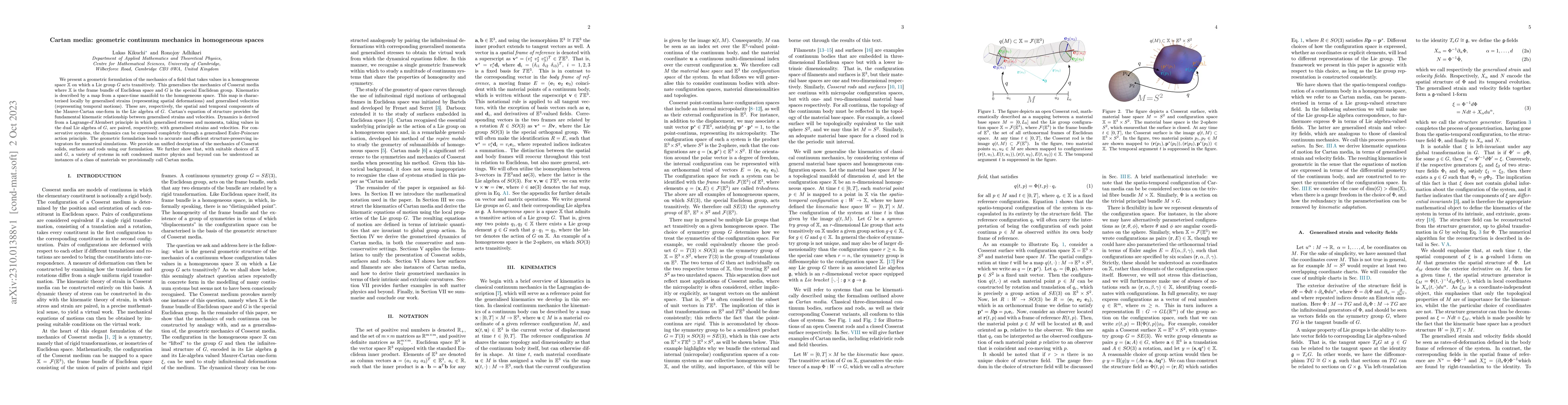 We present a geometric formulation of the mechanics of a field that takes values in a homogeneous space \mathbb{X} on which a Lie group G acts transitively. This generalises the mechanics of Cosserat media where \mathbb{X} is the frame bundle of Euclidean space and G is the special Euclidean group. Kinematics is described by a map from a space-time manifold to the homogeneous space. This map is characterised locally by generalised strains (representing spatial deformations) and generalised velocities (representing temporal motions). These are, respectively, the spatial and temporal components of the Maurer-Cartan one-form in the Lie algebra of G. Cartan's equation of structure provides the fundamental kinematic relationship between generalised strains and velocities. Dynamics is derived from a Lagrange-d'Alembert principle in which generalised stresses and momenta, taking values in the dual Lie algebra of G, are paired, respectively, with generalised strains and velocities. For conservative systems, the dynamics can be expressed completely through a generalised Euler-Poincare action principle. The geometric formulation leads to accurate and efficient structure-preserving integrators for numerical simulations. We provide an unified description of the mechanics of Cosserat solids, surfaces and rods using our formulation. We further show that, with suitable choices of \mathbb{X} and G, a variety of systems in soft condensed matter physics and beyond can be understood as instances of a class of materials we provisionally call Cartan media.