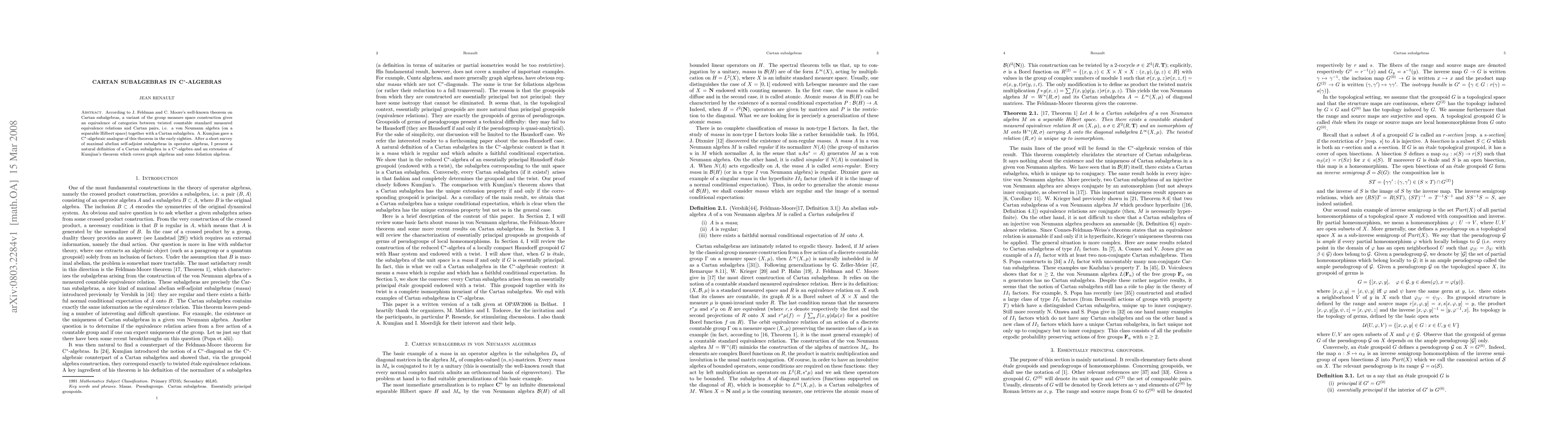 According to J. Feldman and C. Moore's well-known theorem on Cartan subalgebras, a variant of the group measure space construction gives an equivalence of categories between twisted countable standard measured equivalence relations and Cartan pairs, i.e. a von Neumann algebra (on a separable Hilbert space) together with a Cartan subalgebra. A. Kumjian gave a C*-algebraic analogue of this theorem in the early eighties. After a short survey of maximal abelian self-adjoint subalgebras in operator algebras, I present a natural definition of a Cartan subalgebra in a C*-algebra and an extension of Kumjian's theorem which covers graph algebras and some foliation algebras.