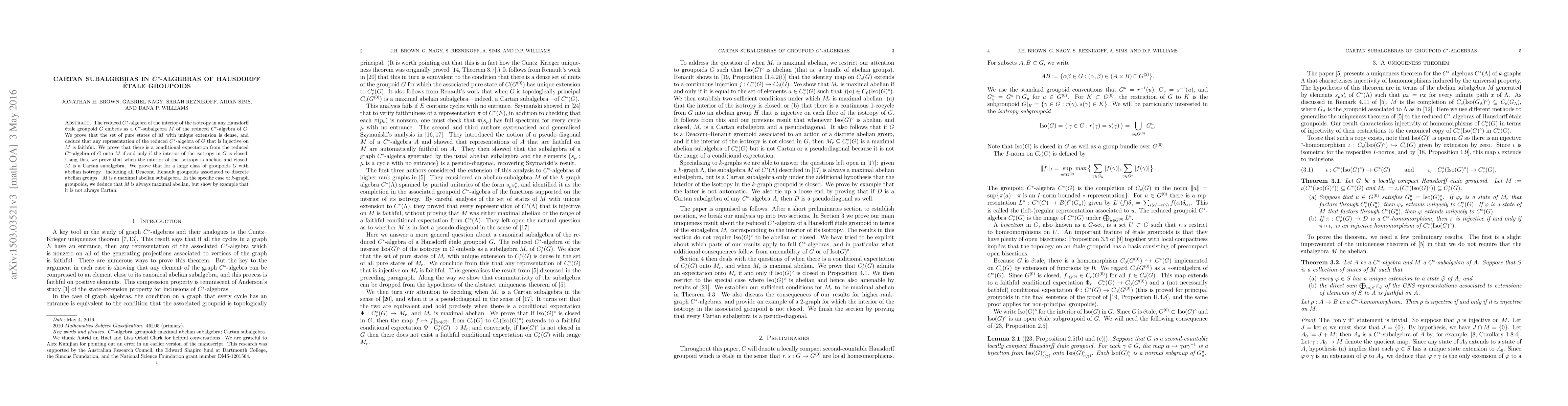 This paper explores Cartan subalgebras within $C^*$-algebras of Hausdorff étale groupoids, proving density of pure states and faithful representations, and conditions for conditional expectations. It establishes that when the interior of the isotropy is abelian and closed, the embedded $C^*$-subalgebra $M$ is a Cartan subalgebra.